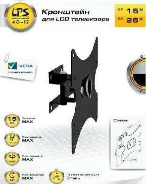 Для ЖК монитора от 15” до 26” габаритные размеры (Ш*Г*В) 230*79*230 мм VESA: 200x100, 200х200, нагрузка до 25 кг. Наклон -5*/+12*, Материал: сталь. Цвет: черный.