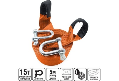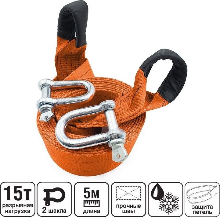 Трос буксировочный с предназначен для буксировки автомобилей и других транспортных средств. Максимальная масса буксируемого автомобиля: 15 т Длина: 5 м (в соответствии с п. 20.3 ПДД) Изготовлен из высокопрочного полиэстера Отличается износостойкостью, морозоустойчивостью и стойкостью к агрессивным средам На протяжении всего срока службы не меняет свои линейные размеры ПРАВИЛА ЭКСПЛУАТАЦИИ: Движение во время буксировки должно быть плавным, без резких рывков и торможений. Не является рывковым тросом! Следить, чтобы провисший трос не намотался на колеса. Не применять для подъёма. Максимальная масса авто: 15 т Комплектация: Скоба такелажная M18 – 2 шт.; Трос буксировочный Длина: 5 м Ширина ленты: 70 мм Состав: Скоба такелажная М18: сталь. Материал ленты: полиэстер.