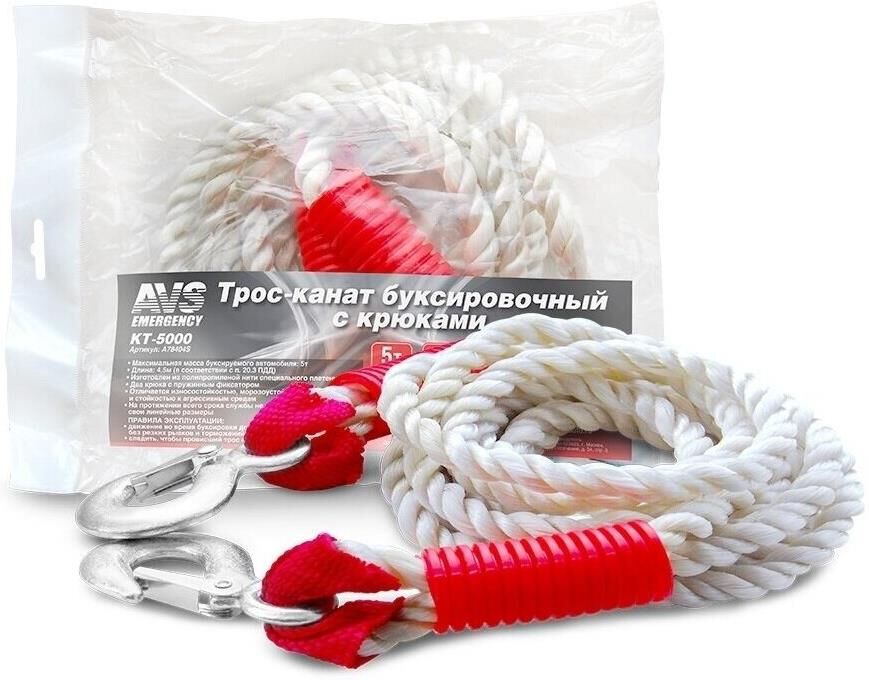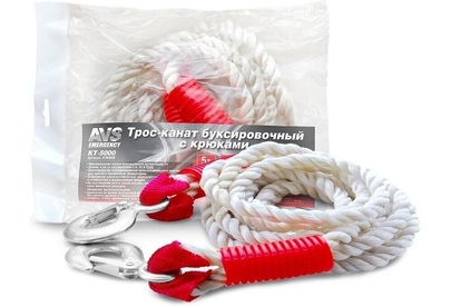 Трос буксировочный AVS KT-5000 канат с крюками 5т 4,5м, в пакете