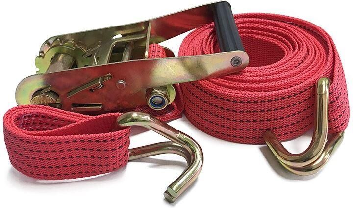Выдерживают нагрузку на прямое стяжное усилие – 2 тонны и стяжное усилие при обхвате – 4 тонны. Характеристики • Храповый стяжной механизм из стали с ручкой типа «Стандарт» (ручка имеет пластиковую ребристую вставку в районе удерживания в ладони для комфортного использования в любых, в том числе, зимних условиях). • Высокопрочная лента из полипропилена 50 мм. Имеет прочные швы. Отличается морозостойкостью и устойчивостью к агрессивным средам. Длина ленты 10 метров. • J – образные стальные крюки.