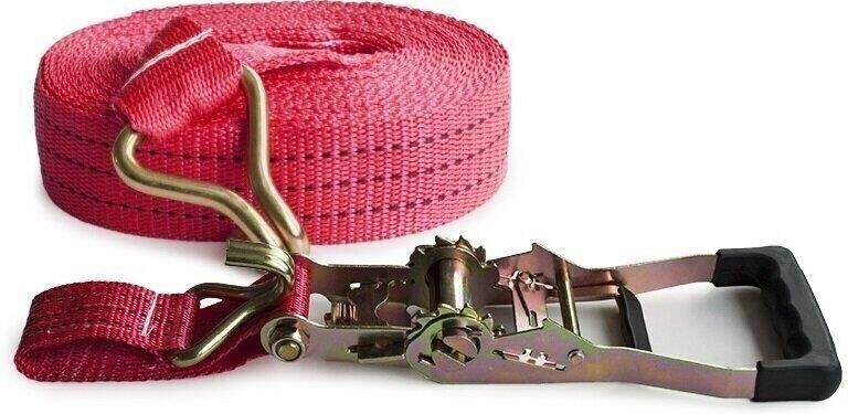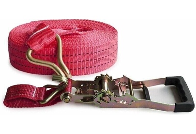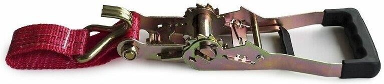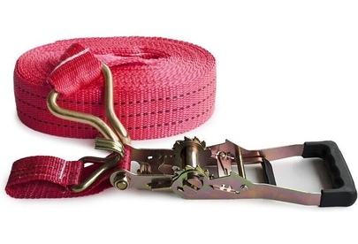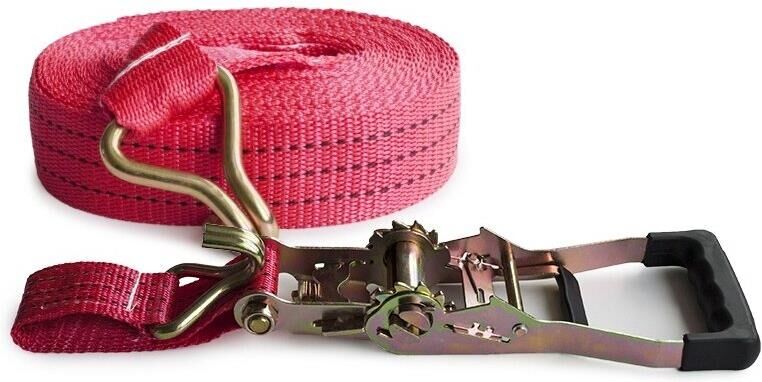 Выдерживают нагрузку на прямое стяжное усилие – 2,5 тонн и стяжное усилие при обхвате – 5 тонн. Характеристики • Храповый стяжной механизм длиной 230мм из высококачественной стали с анатомической ручкой облитой пластиком. • Высокопрочная лента из полипропилена 50 мм. Имеет прочные швы. Отличается морозостойкостью и устойчивостью к агрессивным средам. Длина ленты составляет 12 метров. • J – образные стальные крюки.