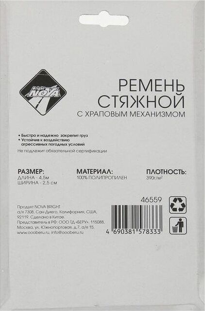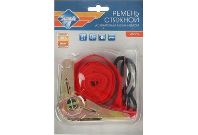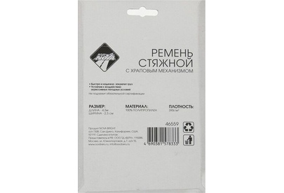 емень стяжной с храповым механизмом быстро и надежно закрепит груз. Устойчив к воздействию агрессивных погодных условий. Материал: 100% полипропилен Длина: 4.5 м. Ширина: 2.5 см. Плотность: 390 г/м2 Допустимая нагрузка: 350кг