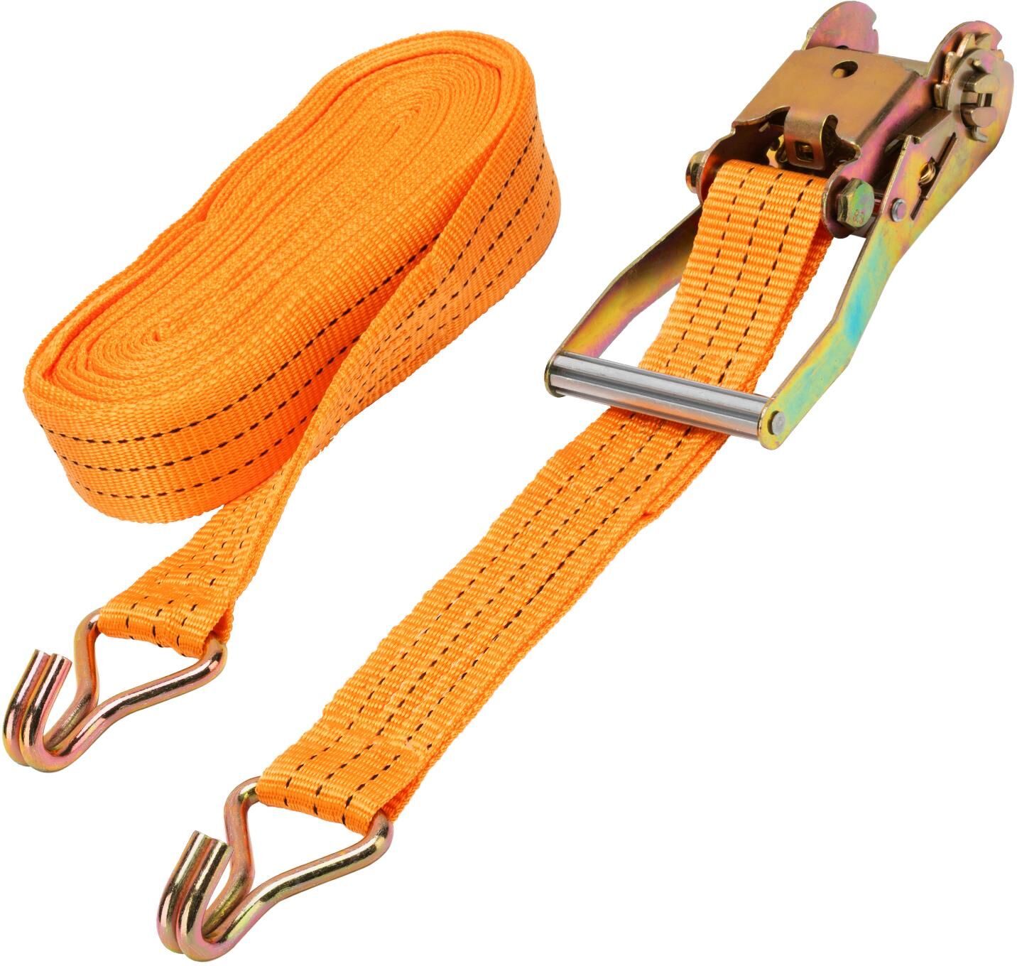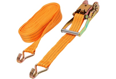 Багажный ремень с крюками Stels 54388 шириной 5 см и длиной 12 м, с храповым механизмом, предназначен для фиксации грузов на решетчатых конструкциях, например, открытых автомобильных багажниках, а также в прицепах. Пригодится для транспортировки различных предметов. Преимущества Износостойкость — ремень изготовлен из прочного и морозостойкого полипропилена, крюки из углеродистой стали устойчивы к деформации. Надежная фиксация груза во время движения и маневров автомобиля — допустимая разрывная нагрузка составляет 800 кг, стальные крюки крепко удерживают натянутый ремень. Комфортное и быстрое затягивание ленты — ремень снабжен храповым механизмом. Удобное хранение — ремень весит 1,774 кг и в сложенном виде очень компактен.
