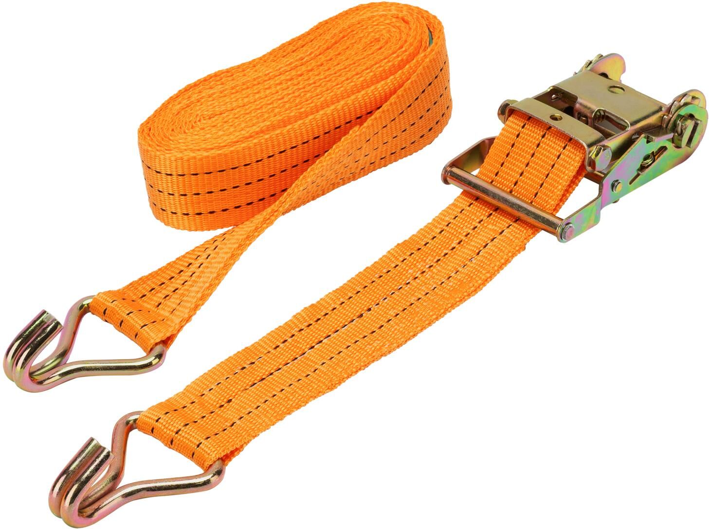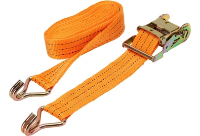 Багажный ремень с крюками Stels 54385 шириной 5 см и длиной 6 м, с храповым механизмом, предназначен для фиксации грузов на решетчатых конструкциях, например, открытых автомобильных багажниках, а также в прицепах. Пригодится для транспортировки различных предметов. Преимущества Износостойкость — ремень изготовлен из прочного и морозостойкого полипропилена, крюки из углеродистой стали устойчивы к деформации. Надежная фиксация груза во время движения и маневров автомобиля — допустимая разрывная нагрузка составляет 800 кг, стальные крюки крепко удерживают натянутый ремень. Комфортное и быстрое затягивание ленты — ремень снабжен храповым механизмом. Удобное хранение — ремень весит 1,069 кг и в сложенном виде очень компактен.