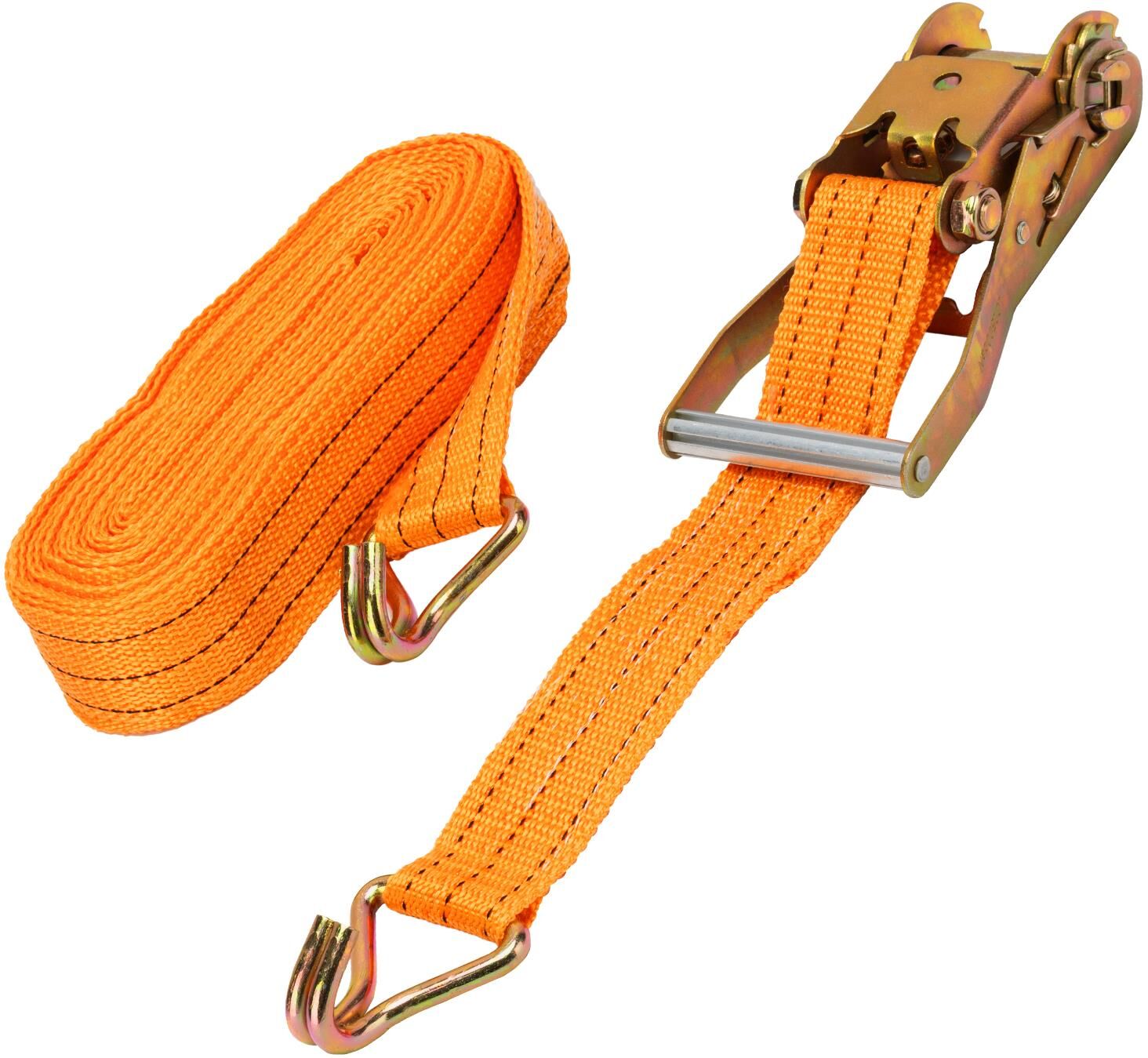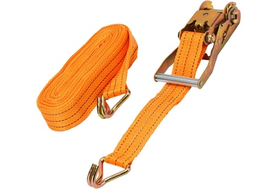 Багажный ремень с крюками Stels 54385 шириной 5 см и длиной 10 м, с храповым механизмом, предназначен для фиксации грузов на решетчатых конструкциях, например, открытых автомобильных багажниках, а также в прицепах. Пригодится для транспортировки различных предметов. Преимущества Износостойкость — ремень изготовлен из прочного и морозостойкого полипропилена, крюки из углеродистой стали устойчивы к деформации. Надежная фиксация груза во время движения и маневров автомобиля — допустимая разрывная нагрузка составляет 800 кг, стальные крюки крепко удерживают натянутый ремень. Комфортное и быстрое затягивание ленты — ремень снабжен храповым механизмом. Удобное хранение — ремень весит 1,52 кг и в сложенном виде очень компактен.