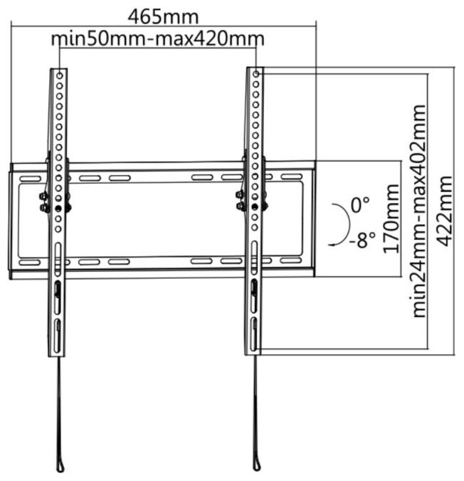 Для использования с телевизорами диагональю 32"-55", весом до 40кг. Возможен наклон до 8 градусов .Расстояние телевизора от стены 20.5мм. VESA 200X200, 400x200, 300x300, 400x400