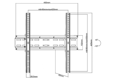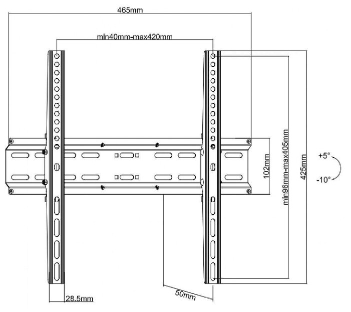 Для использования с телевизорами диагональю 32"-55", весом до 35кг. Возможен наклон до 10 градусов и подъем до 7 градусов .Расстояние телевизора от стены 50мм. VESA 200x200, 300x200,300x300,400x200,400x300, 400x400