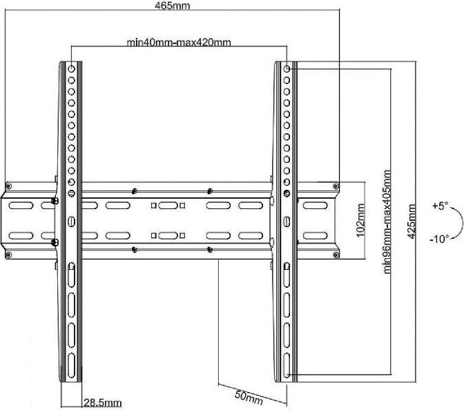 Для использования с телевизорами диагональю 32"-55", весом до 35кг. Возможен наклон до 10 градусов и подъем до 7 градусов .Расстояние телевизора от стены 50мм. VESA 200x200, 300x200,300x300,400x200,400x300, 400x400