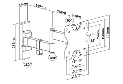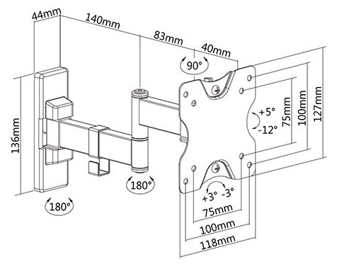 Для использования с телевизорами диагональю 13"-27", весом до 20кг. Возможен наклон до 12 градусов и подъем до 5 градусов Поворот влево и вправо на 45 градусов . Расстояние телевизора от стены 50-263мм. VESA 75x75, 100x100