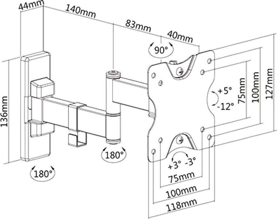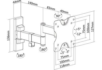 Для использования с телевизорами диагональю 13"-27", весом до 20кг. Возможен наклон до 12 градусов и подъем до 5 градусов Поворот влево и вправо на 45 градусов . Расстояние телевизора от стены 50-263мм. VESA 75x75, 100x100