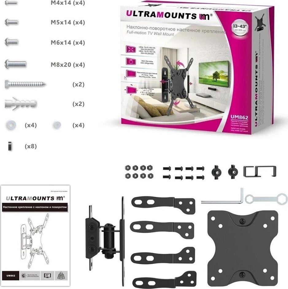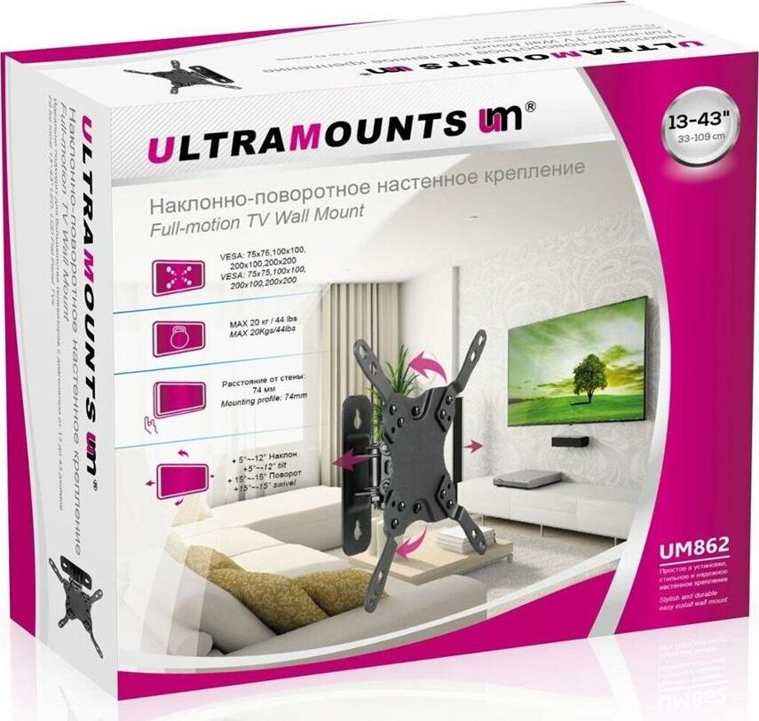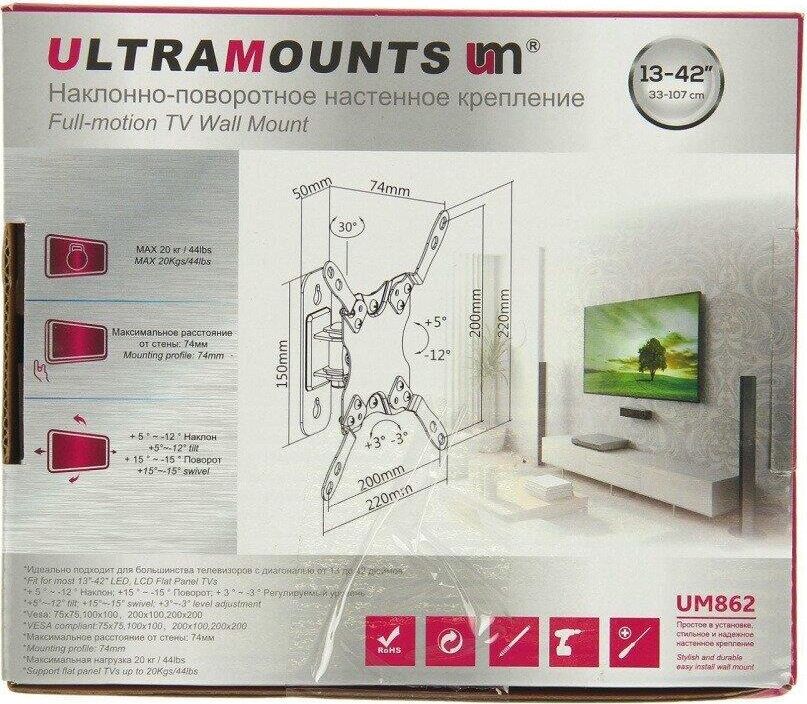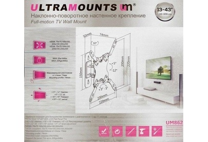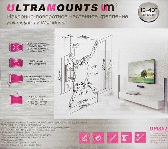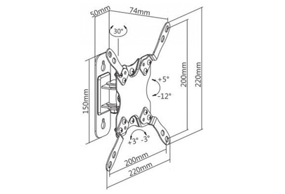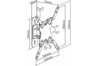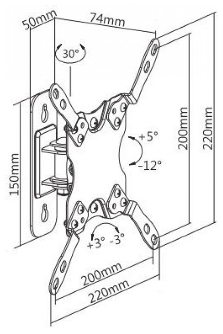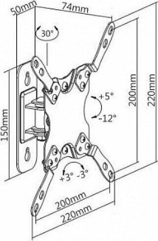 Для использования с телевизорами диагональю 13"-42", весом до 25кг. Возможен наклон до 12 градусов и подъем до 5 градусов Поворот влево и вправо на 15 градусов . Расстояние телевизора от стены 74мм. VESA 75x75, 100x100, 200x200