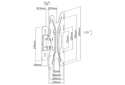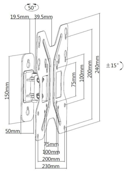 Для использования с телевизорами диагональю 23"-42", весом до 30кг. Возможен наклон до 12 градусов и подъем до 5 градусов Поворот влево и вправо на 25 градусов. Расстояние телевизора от стены 59мм. VESA 75x75, 100x100, 200x200.