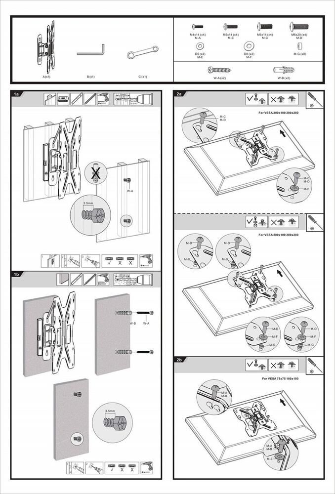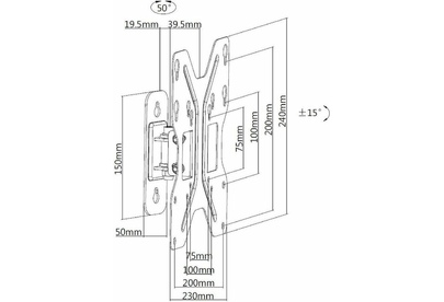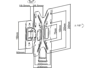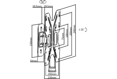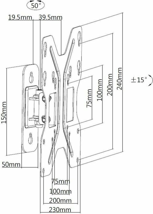 Для использования с телевизорами диагональю 23"-42", весом до 30кг. Возможен наклон до 12 градусов и подъем до 5 градусов Поворот влево и вправо на 25 градусов. Расстояние телевизора от стены 59мм. VESA 75x75, 100x100, 200x200.