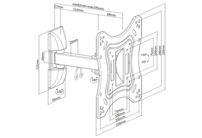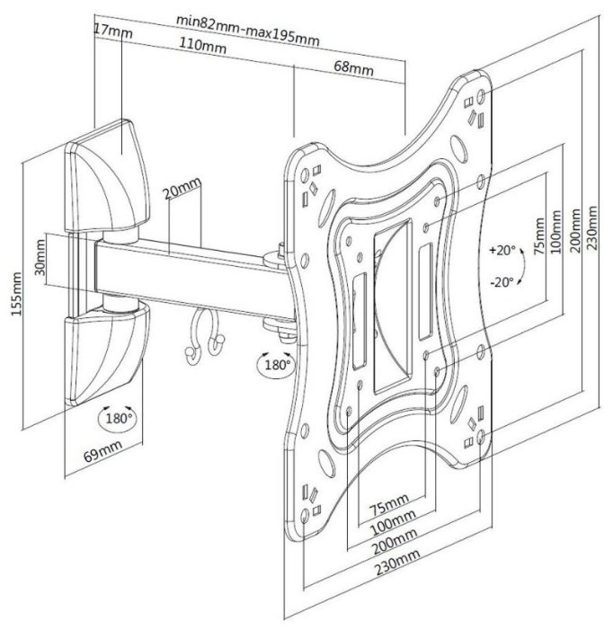 Для использования с телевизорами диагональю 23"-42", весом до 20кг. Возможен наклон до 20 градусов и подъем до 20 градусов Поворот влево и вправо на 90 градусов . Расстояние телевизора от стены 82-195мм. VESA 75x75, 100x100, 200x200