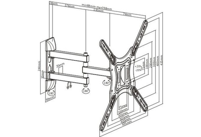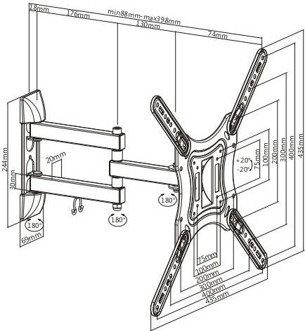 Для использования с телевизорами диагональю 23"-55", весом до 30кг. Расстояние телевизора от стены 88-398мм. VESA 75x75, 100x100, 200x200, 300x300,400x400. Возможен наклон до 20 градусов и подъем до 20 градусов. Поворот влево и вправо на 90 градусов .