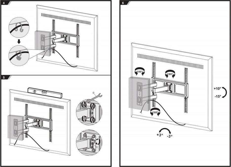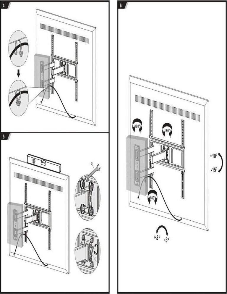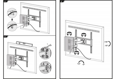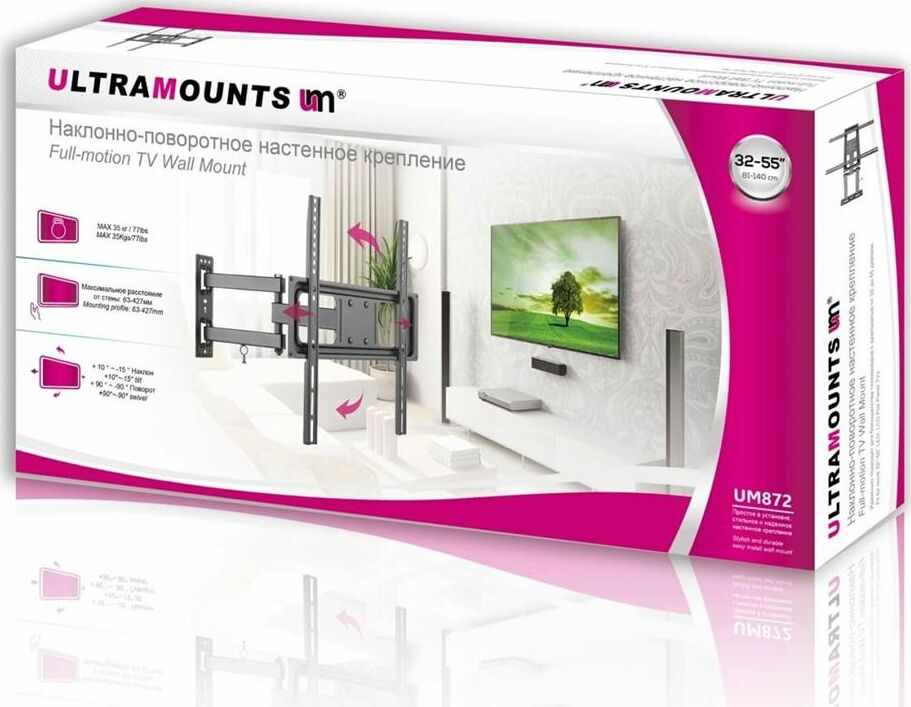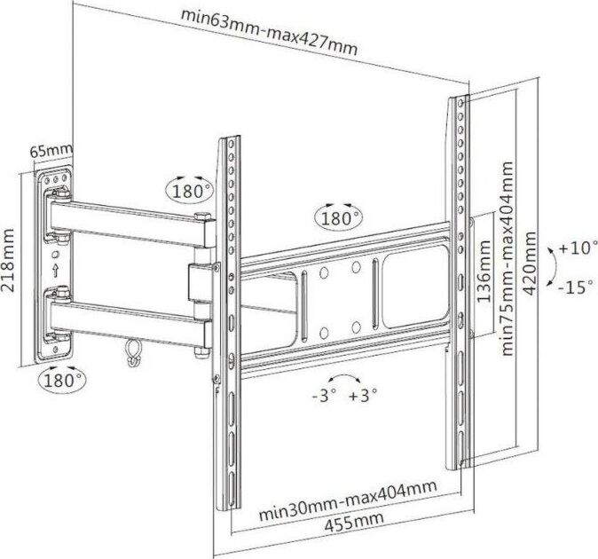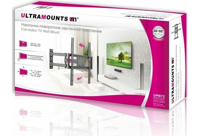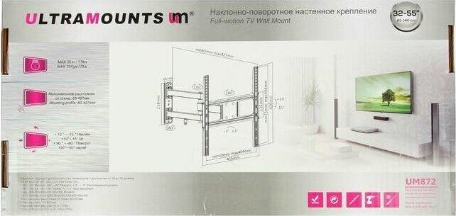 Для использования с телевизорами диагональю 32"-55", весом до 45кг. Возможен наклон до 15 градусов и подъем до 10 градусов Поворот влево и вправо на 90 градусов. Расстояние телевизора от стены 63-427мм. VESA 200x200, 300x300,400x400.