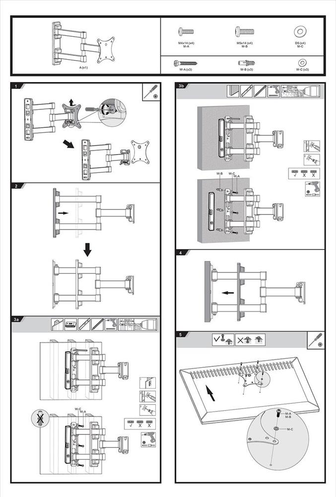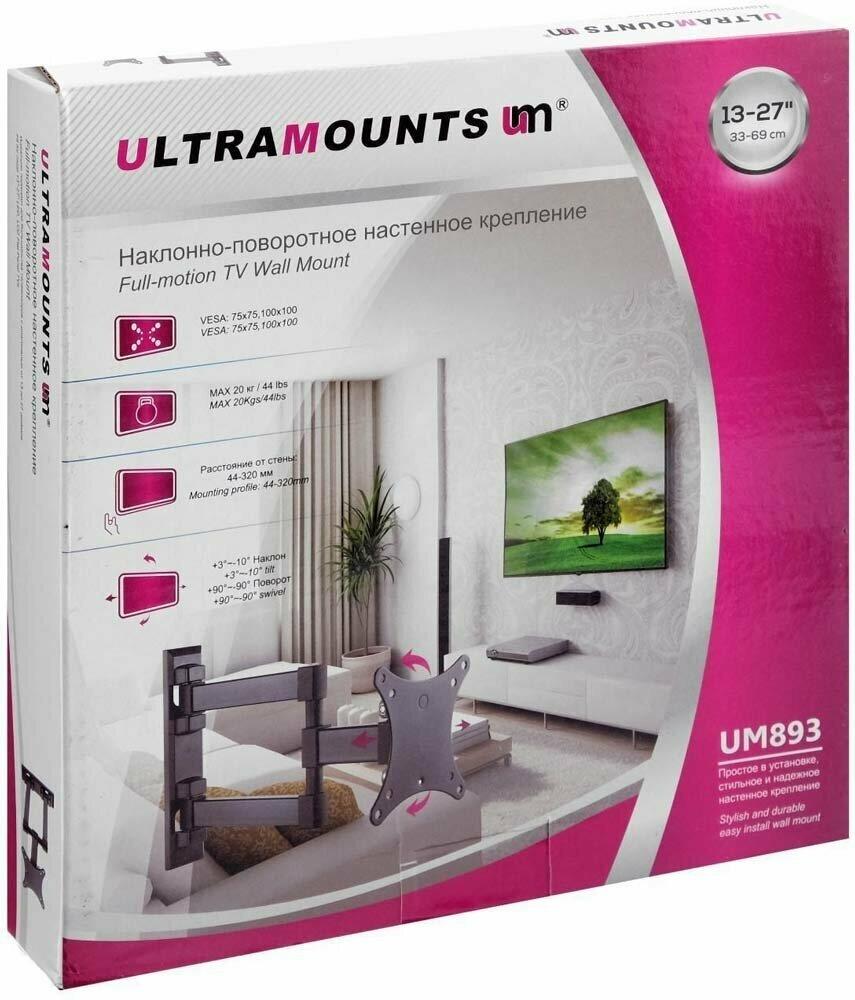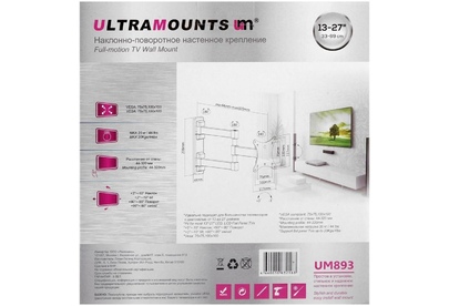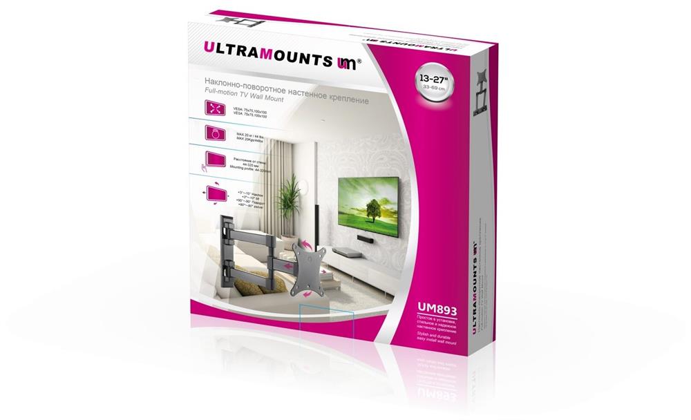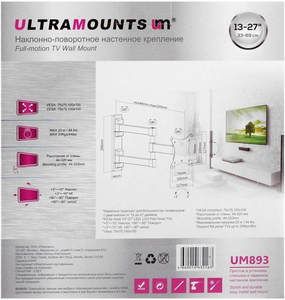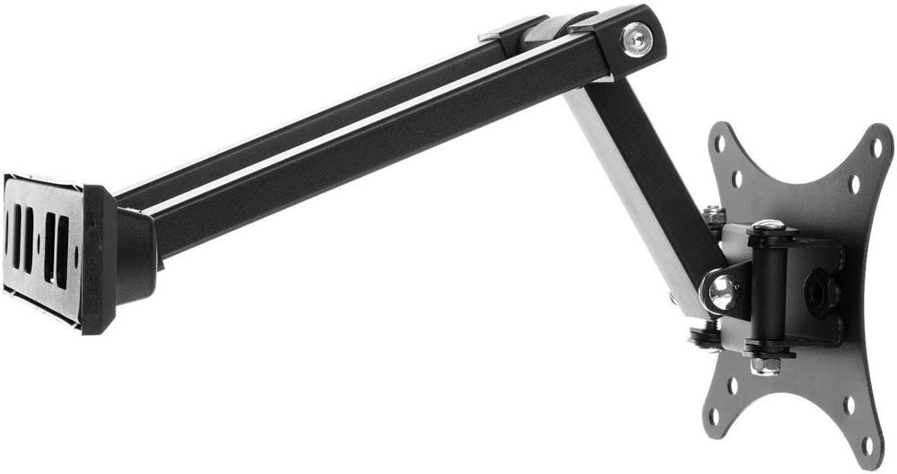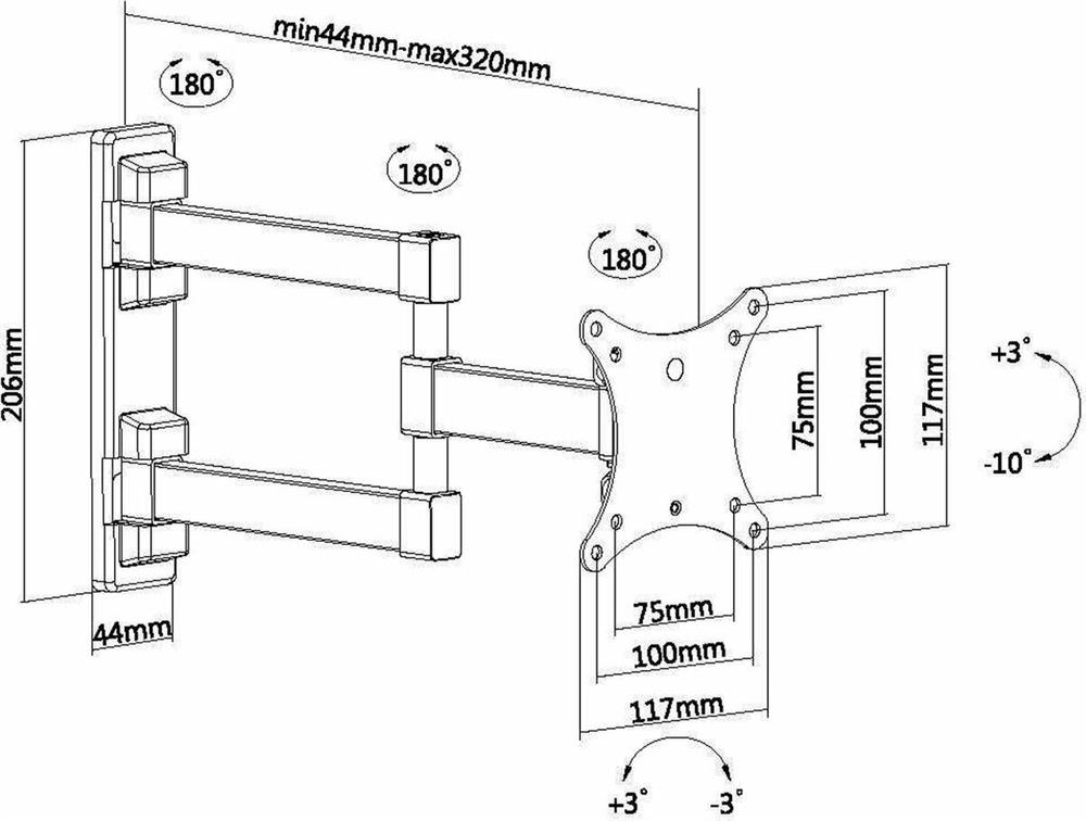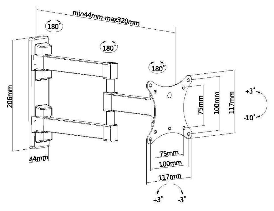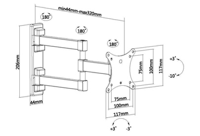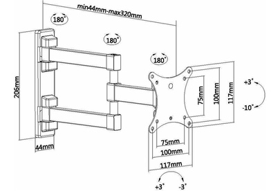 Наклонно-поворотный кронштейн со свободным наклоном и встроенной регулировкой уровня. Для использования с телевизорами 13"-27" весом до 30кг. Расстояние телевизора от стены 44-320мм. VESA 75x75,100x100. Возможен наклон до 10 градусов и подъем до 3 градусов. Поворот влево и вправо на 90 градусов . Есть регулировка экрана по часовой и против часовой стрелки на 3 градуса.