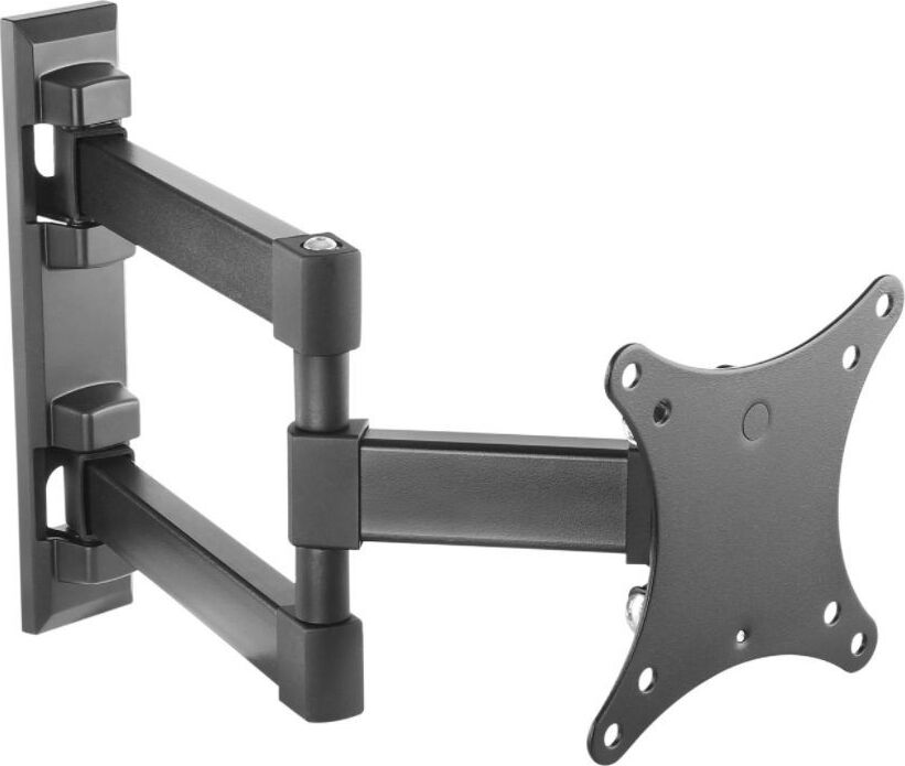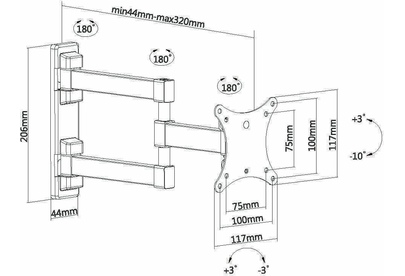 Наклонно-поворотный кронштейн со свободным наклоном и встроенной регулировкой уровня. Для использования с телевизорами 13"-27" весом до 30кг. Расстояние телевизора от стены 44-320мм. VESA 75x75,100x100. Возможен наклон до 10 градусов и подъем до 3 градусов. Поворот влево и вправо на 90 градусов . Есть регулировка экрана по часовой и против часовой стрелки на 3 градуса.