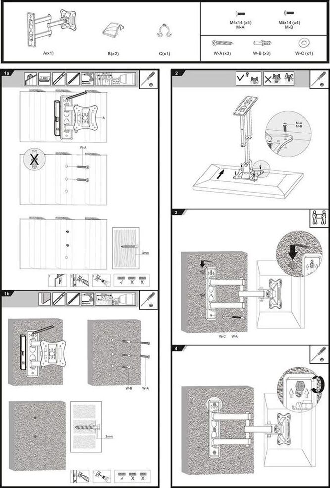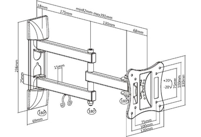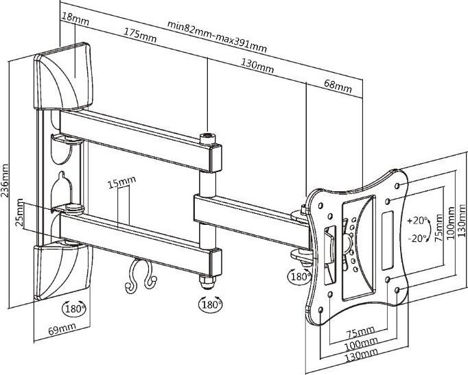 Наклонно-поворотный кронштейн со свободным наклоном. Для использования с телевизорами 13"-27" весом до 15кг. Расстояние телевизора от стены 82-391мм. VESA 75x75,100x100. Возможен наклон до 20 градусов и подъем до 20 градусов. Поворот влево и вправо на 90 градусов .
