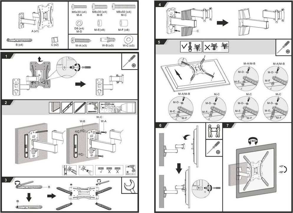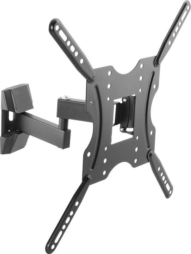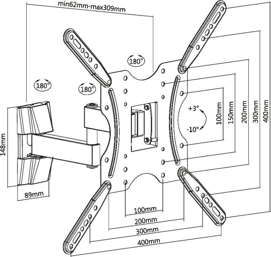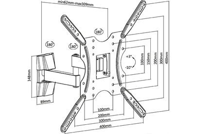 Наклонно-поворотный кронштейн со свободным наклоном. Открытая конструкция обеспечивает повышенную вентиляцию и облегчает доступ к проводам. Для использования с телевизорами 32"-55" весом до 20кг. Расстояние телевизора от стены 62~309мм. VESA 100x100,200x100,200x200,300x200,300x300,400x200,400x400. Возможен наклон до 10 градусов и подъем до 3 градусов. Поворот влево и вправо на 90 градусов .