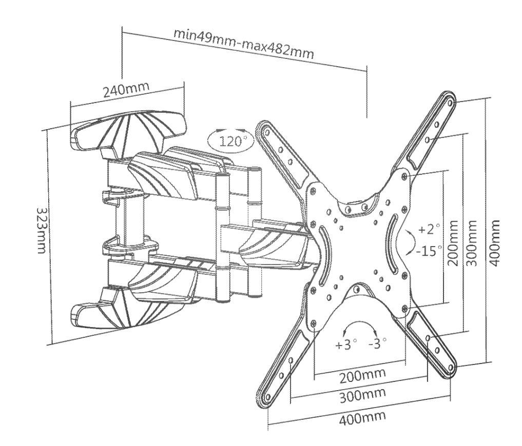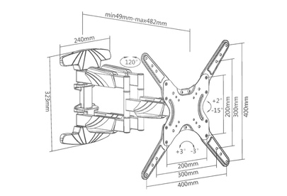 Наклонно-поворотный кронштейн со свободным наклоном. Встроенная регулировка уровня поможет найти идеальную позицию. Для использования с телевизорами 23"-55" весом до 40кг. Расстояние телевизора от стены 49-482мм. VESA 200x100,200x200,300x300,400x200,400x300,400x400. Возможен наклон до 15 градусов и подъем до 2 градусов. Поворот влево и вправо на 60 градусов . Есть регулировка экрана по часовой и против часовой стрелки на 3 градуса.