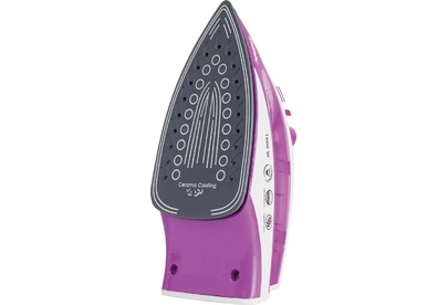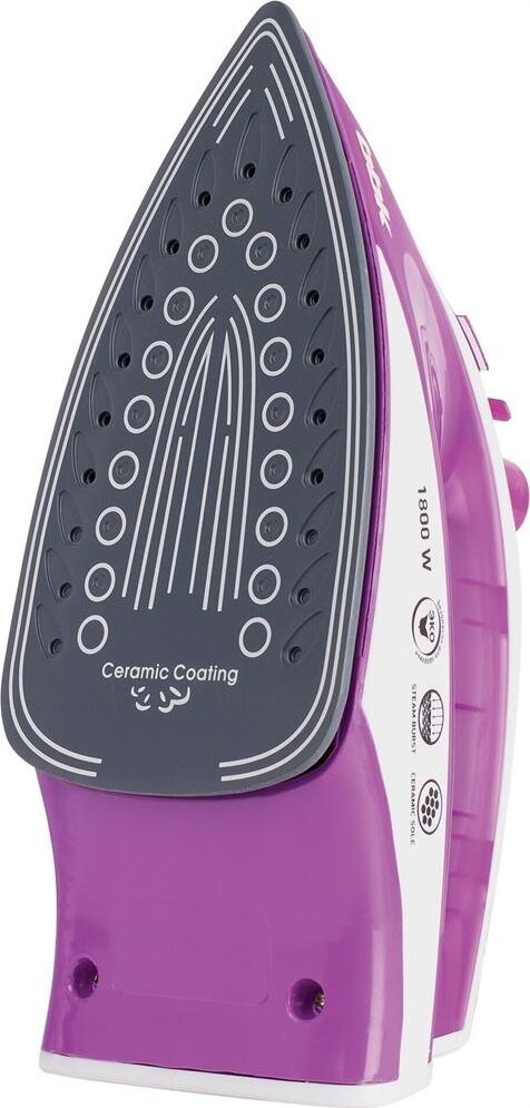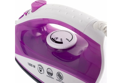 Мощность 1800 Вт, керамическое покрытие подошвы, паровой удар, вертикальное отпаривание, плавные регулировки подачи пара и температуры, устройство распыления воды, защита от накипи, длина шнура 1,6 м.