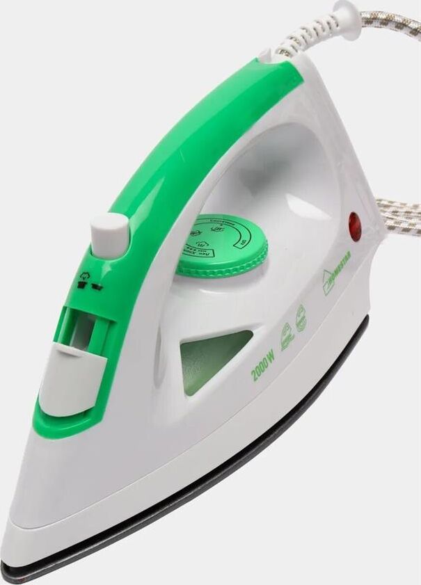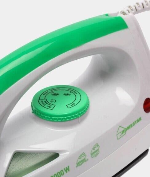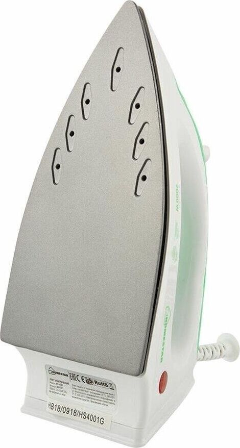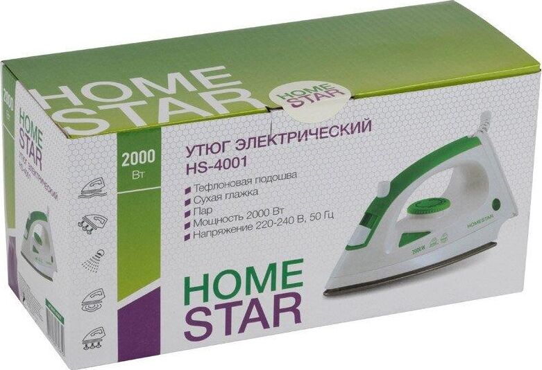 HOMESTAR HS-4001 бело-зеленый Тефлоновая подошва Сухая глажка Пар Длина шнура: 1,5м Мощность 2000 Вт Напряжение 220-240 В, 50 Гц Состав: металл, пластик