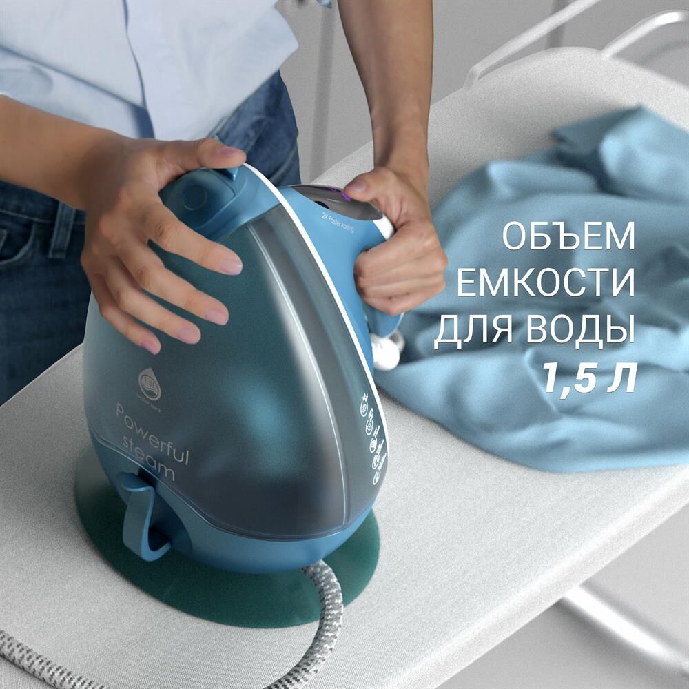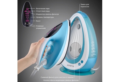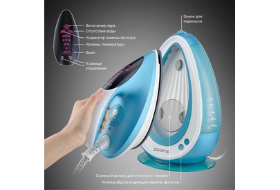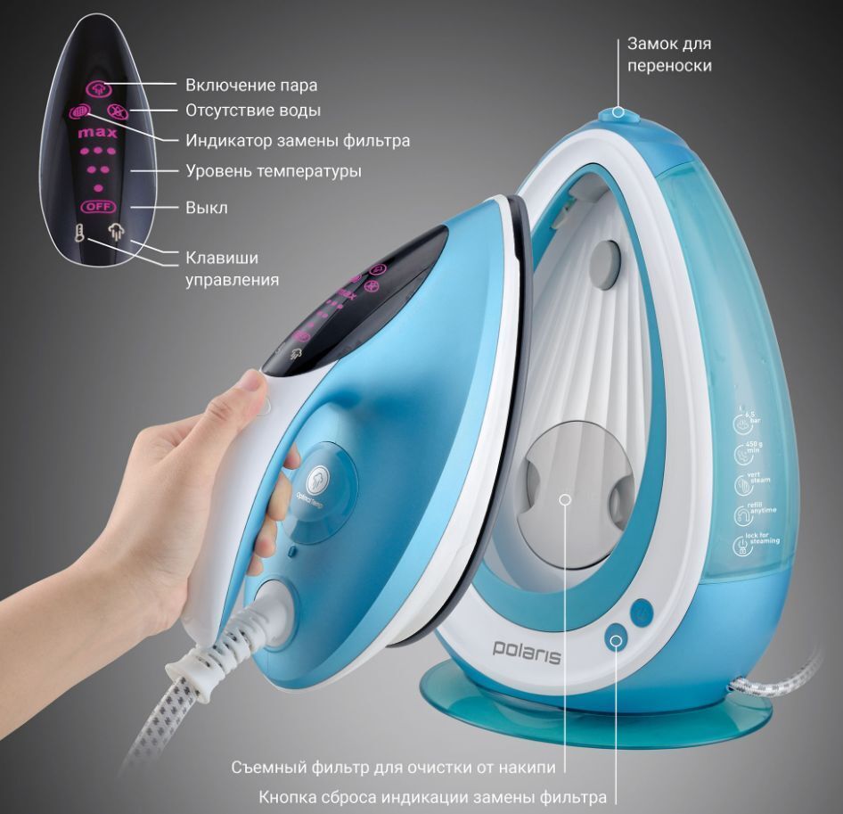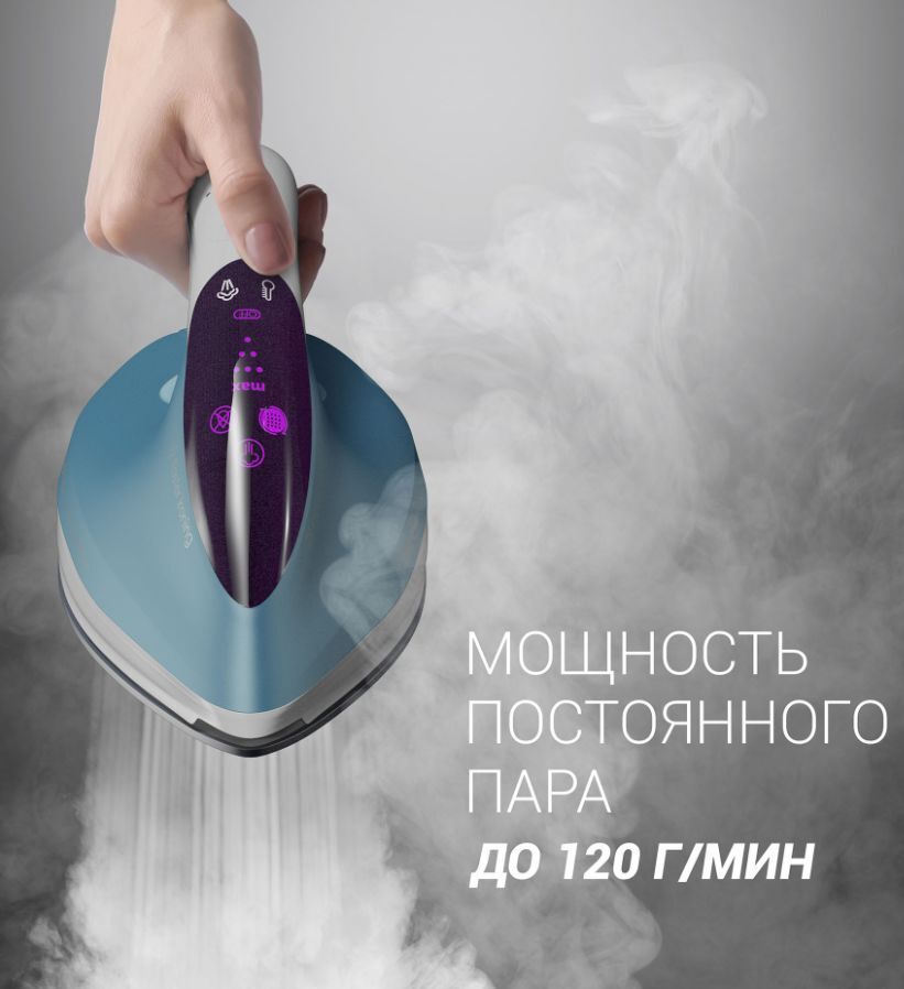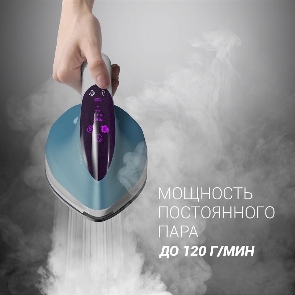 Мощность, 2400 Вт.Съемный фильтр для очистки от накипи.КОМПАКТНЫЙ РАЗМЕР - ИДЕАЛЬНО ДЛЯ ХРАНЕНИЯ.Керамическое покрытие подошвы - PRO 5 Ceramic. Готовность к работе через 60 сек.Давление пара до 6,5бар.Объем емкости для воды 1,5 л.Съемный фильтр для очистки от накипи.Долив воды во время глажки. Электронное управление на ручке.Автоотключение при отсутствии воды. Замок для удобной переноски прибора.Удобная фиксация парового шланга и шнура на базе.Мощность 2400 Вт.Режимы работы: - сухое глажение; - мощность постоянного пара до 120 г/мин; - вертикальное отпаривание.