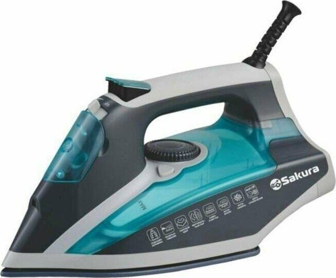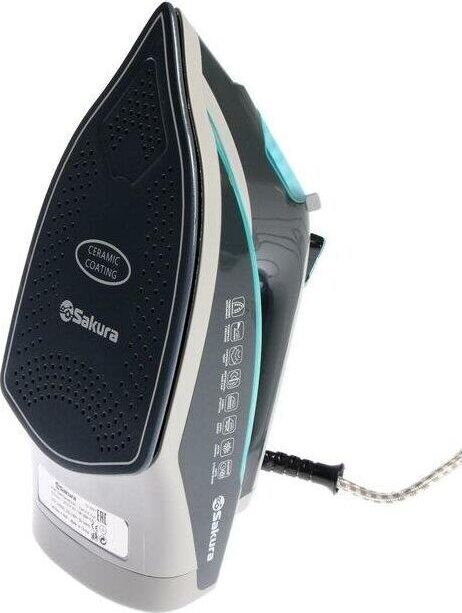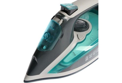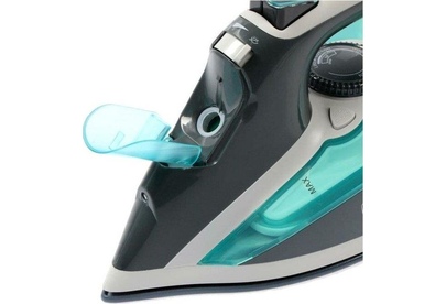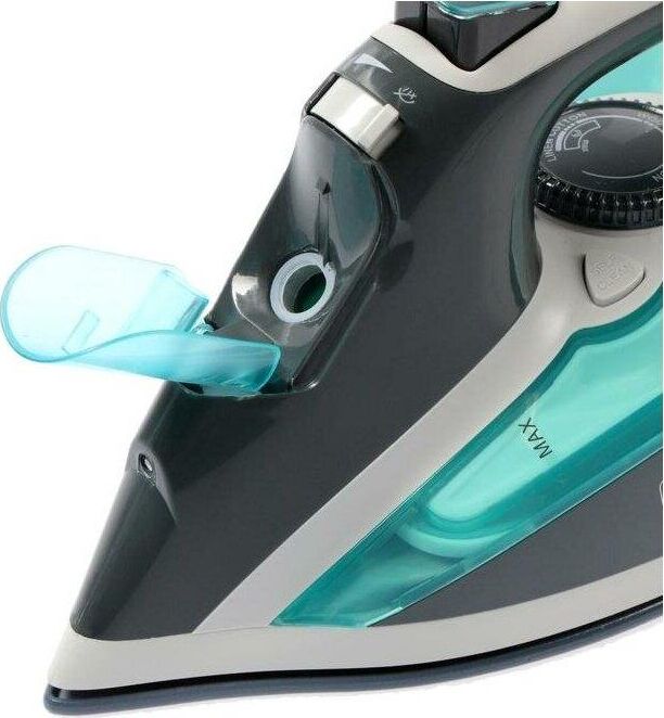 Мощность 2600Вт, резервуар для воды 400мл, керамическая подошва (233х122 мм), сухое глажение / глажение с пароувлажнением, регулировка подачи пара, мощный паровой удар, вертикальный пар, автоматическое отключение (через 8 мин без движения в вертикальном положении и через 30 сек в горизонтальном положении), самоочистка, защита от протекания и накипи (anti-drip и anti-calc), световой индикатор работы, кабель питания 2 м. Цвет: серый/бирюзовый.