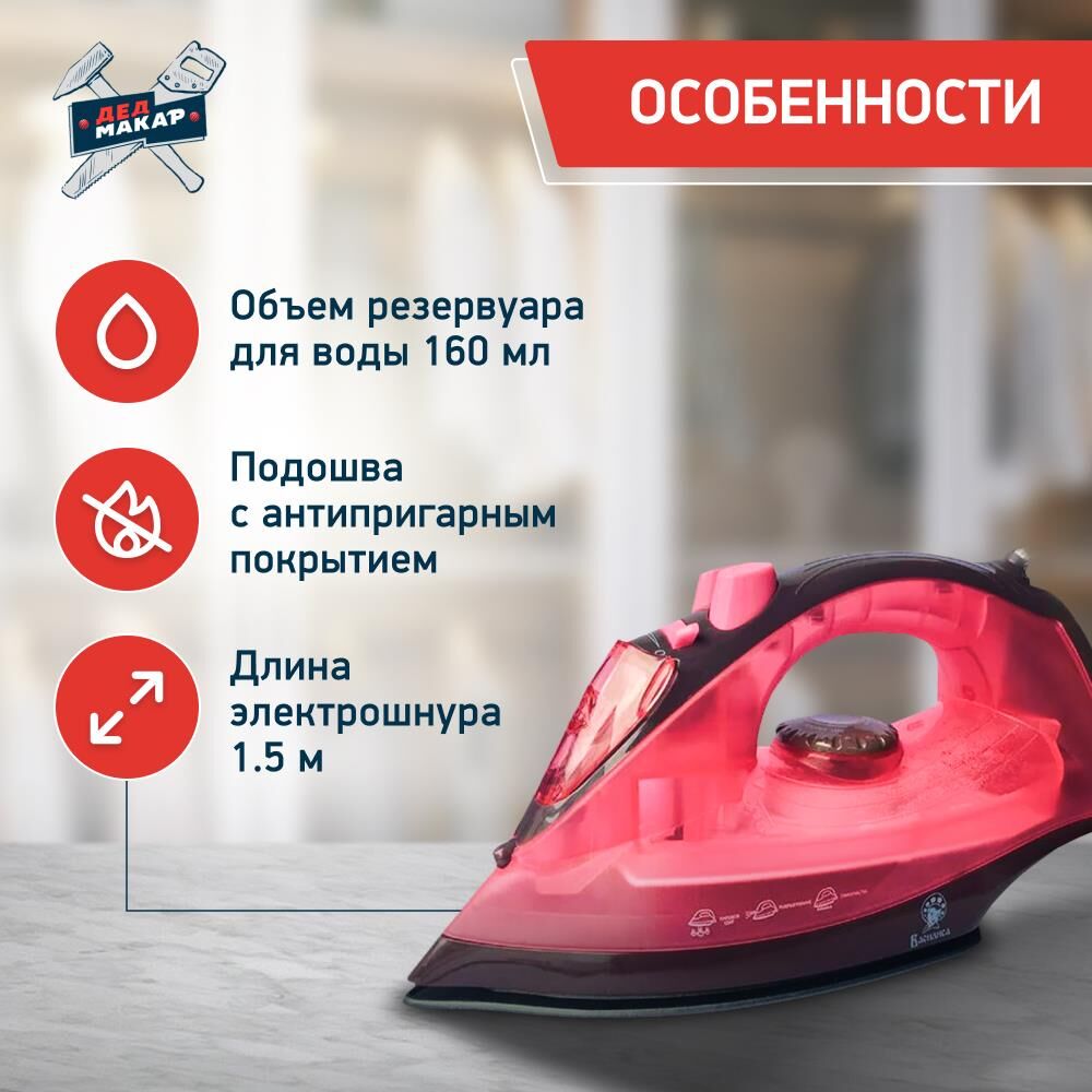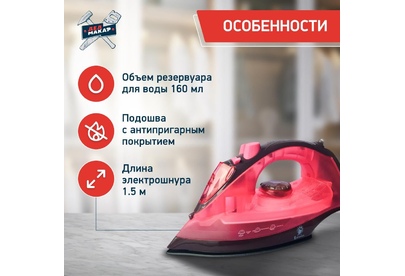 Макс. мощность 2200 Вт. Объем резервуара для воды 160 мл. Длина электрошнура 1,5 м. Подошва с антипригарным покрытием. Прозрачный резервуар для воды. Индикатор нагрева утюга. Терморегулятор. 3 рабочих режима: сухое глажение, отпаривание, разбрызгивание воды. Возможность регулировки степени отпаривания. Функция Паровой удар. Функция Самоочистка. Защита от перегрева. Цвет: розовый с коричневым.