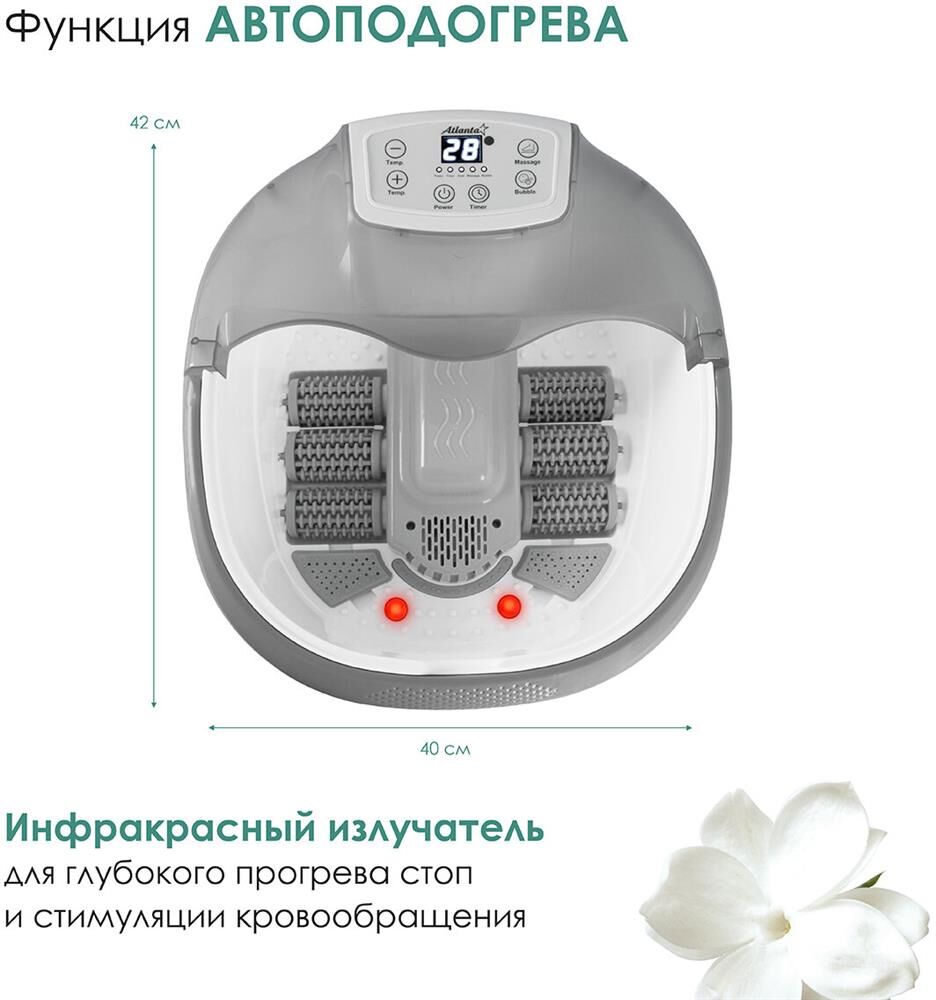 Гидромассажная ванночка Atlanta ATH-6417 - это уникальное устройство, которое сочетает в себе множество полезных функций. Atlanta ATH-6417 оснащена мощным компрессором для гидро-пузырькового массажа, который обеспечивает интенсивное воздействие на мышцы и ткани. Акупунктурный массаж, который также входит в комплект, помогает улучшить кровообращение и снять напряжение. Устройство имеет цифровое управление с удобным дистанционным пультом, что делает его использование максимально комфортным.