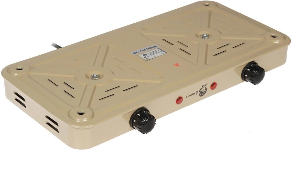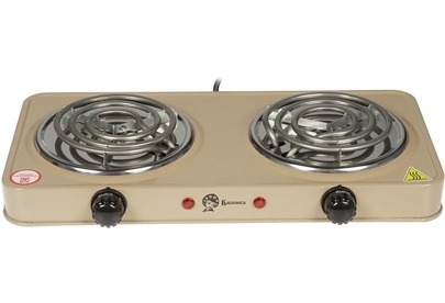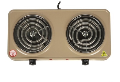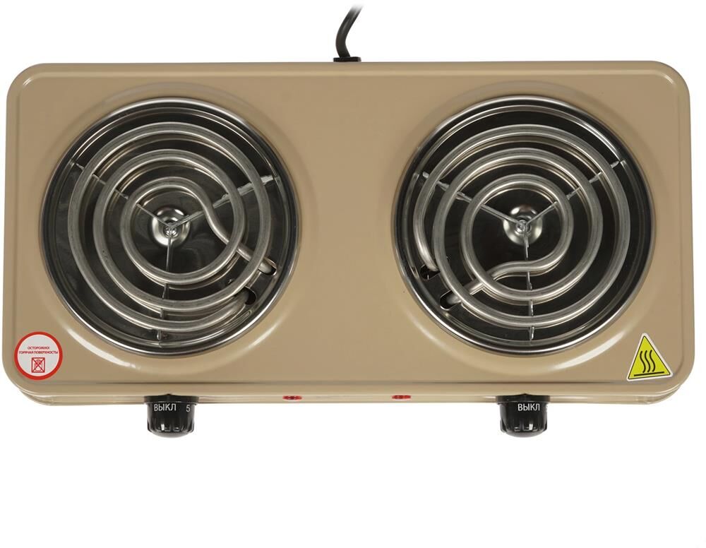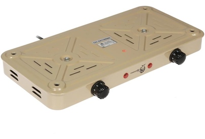Номинальная потребляемая мощность 2000 Вт. Количество конфорок 2 штуки. Эмалированная рабочая поверхность. Цвет эмали: бежевый. Спиралевидные электроконфорки. Поворотные механические переключатели. Световой индикатор работы. Терморегулятор. Ножки - 4 штуки.