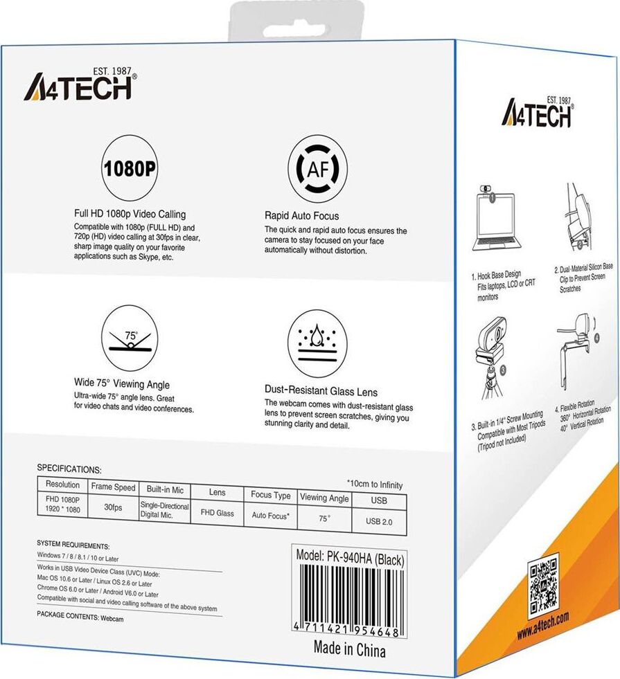 Вебкамера A4TECH Web-камера PK-940HA, черный