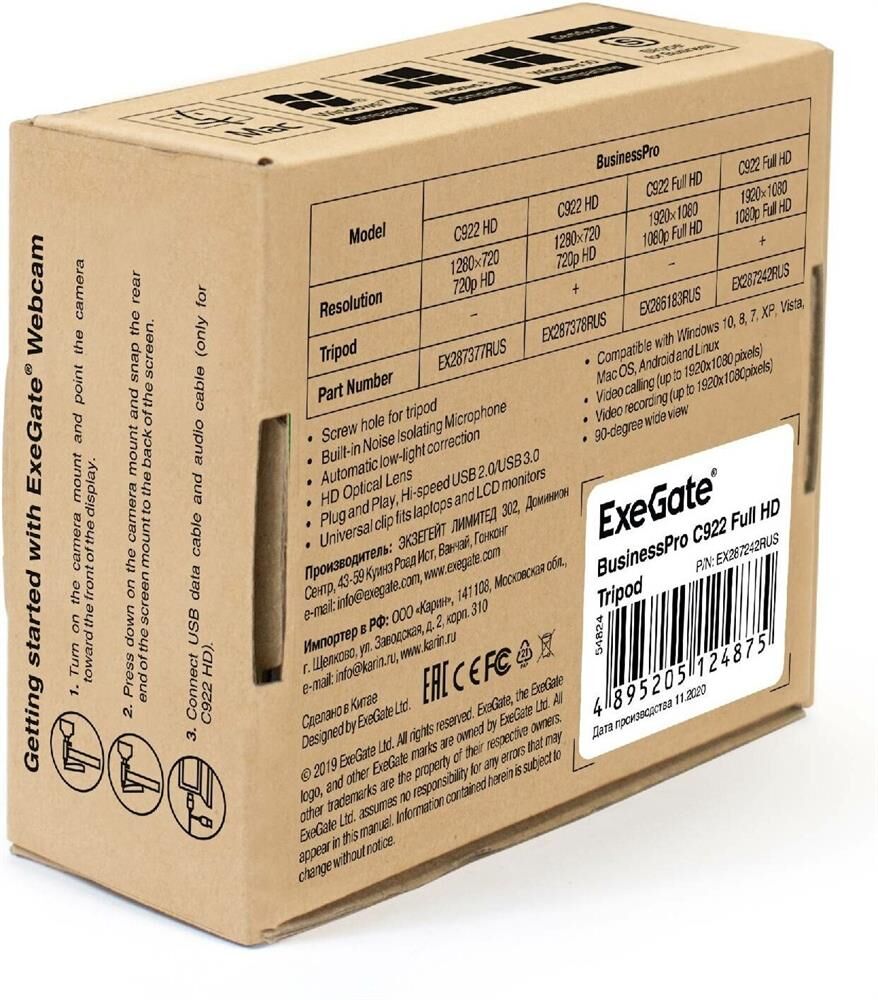 [веб камеры ] Exegate EX287242RUS Веб-камера ExeGate BusinessPro C922 FullHD Tripod, USB, 1920х1080, микр. с шумоподавл, универс. крепл.[EX287242RUS] Exegate EX287242RUS Веб-камера ExeGate BusinessPro C922 FullHD Tripod, USB, 1920х1080, микр. с шумоподавл, универс. крепл.[EX287242RUS] масса(кг) 0.29 GTD Number 10013160/040723/3301136/18 GTIN 04895205124875 Cтрана-производитель китай Партномер EX287242RUS WEB-интерфейс Нет Беспроводной интерфейс Нет Видеосъёмка Нет Встроенный микрофон Есть высота(см)