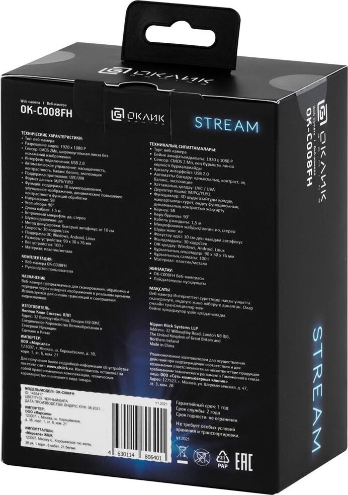 Интерфейс: USB2.0. Микрофон: есть. Автоматическая фокусировка: есть. Тип матрицы: CMOS. Разрешение матрицы: 2. Запись видео высокой четкости: 1080p. Скорость записи видео, до: 30. Формат видеовызовов: MJPG/YUY2. Шумоподавление микрофона: есть. Тип установки (крепления): универсальный. Длина кабеля: 1.5. Тип поставки: Ret. Вес камеры: 100. Партномер: OK-C008FH. Угол обзора: 90. Габариты упаковки (ед) ДхШхВ: 0.12x0.071x0.175. Вес упаковки (ед): 0.16. Гарантия: 12 мес.. Разрешение фото (без интерполяции): 1920 х 1080 пикселей. Разрешение видео (без интерполяции): 1920 х 1080 пикселей. Цвет: черный. Размеры (ШхВхГ): 90 х 76 х 30 мм. Функции: автоматическая фокусировка. Разрешение видео: 1920 х 1080 пикселей. Запись видео: 1080p 30 кад/сек. Угол обзора: 90 °. Особенности: встроенный микрофон. Интерфейс: USB2.0