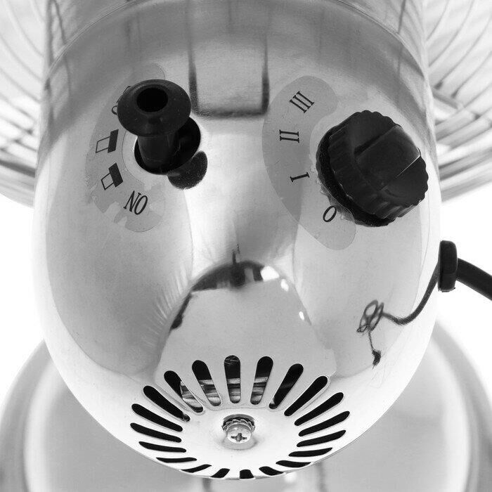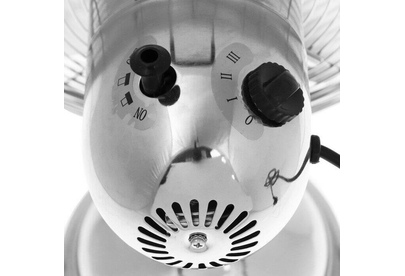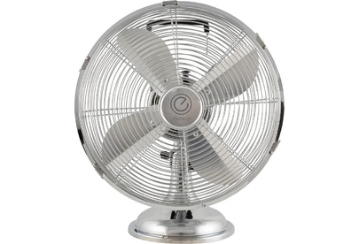 Серия Elegance. Диаметр 12". Современный дизайн. Металлический хромированный корпус. Алюминиевые лопасти. Ручка для переноски. Высота 41 см. 3 скорости . Функция поворота. Мощность 40Вт.
