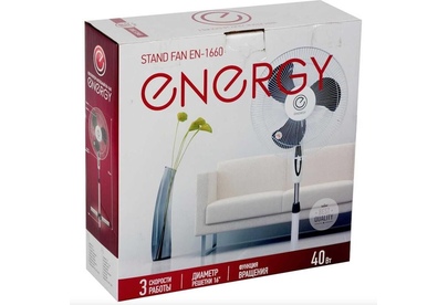 ENERGY EN-1660 (напольный) 16" белый Диаметр 16" Подставка 52*52см Высота 1,25м Лучевая решетка 3 скорости Регулировка наклона Функция поворота Мощность 40Вт 1 шт./коробка