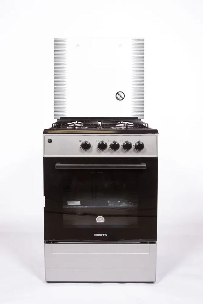 Габариты, ВхШхГ: 85х60х60; Цвет: серый; Горелки стола: Газовые – 4 шт.; Мощность горелок рабочего стола: Горелка передняя левая/правая: 2,0/2,4 кВт.; Горелка задняя левая/правая: 2,0/1,0 кВт.; Мощность горелки духовки: 2,5 кВт.; Объем духовки: 65 л.; Верхний/нижний нагреватель духовки: газ. Газ-контроль: полный; Решетка рабочего стола: сталь; Крышка рабочего стола: стекло; Термометр духовки; Кнопка электророзжига горелок стола; Электрическая подсветка духовки; Противень: 2 шт.