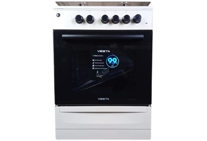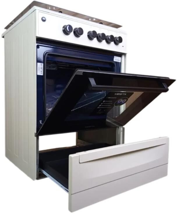 Горелки стола: Газовые – 4 шт. Выдвижной ящик для посуды. Мощность горелок рабочего стола: Горелка передняя левая/правая – 2,0/2,4 кВт. Горелка задняя левая/правая – 2,0/1,0 кВт. Электрический духовой шкаф. Объем духовки в литрах: 65 л. Верхний/нижний нагреватель духовки – тен.Решетка рабочего стола – сталь. Крышка рабочего стола – стекло. Термометр духовки. Кнопка электророзжига горелок стола. Электрическая подсветка духовки. Противень – 2 шт. В/Ш/Г 850/600/600