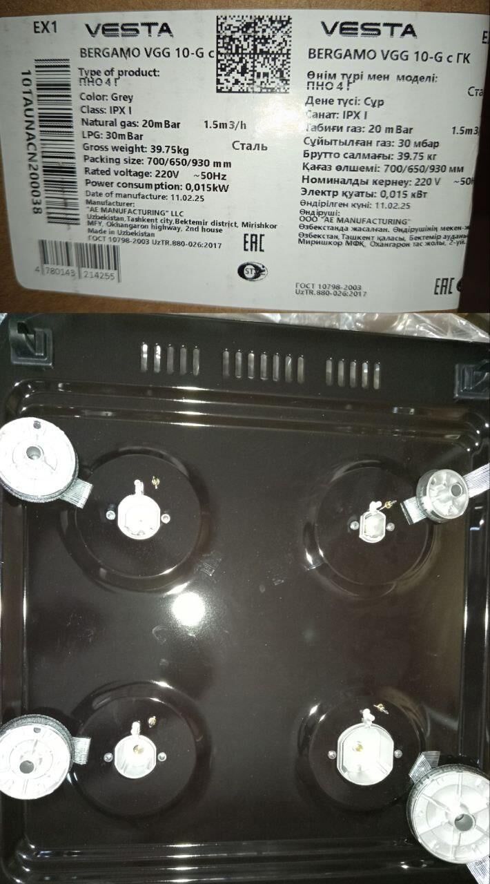 Горелки стола: Газовые – 4 шт.Газ.контроль - рабочей поверхности. Мощность горелок рабочего стола: Горелка передняя левая/правая – 2,0/2,4 кВт. Горелка задняя левая/правая – 2,0/1,0 кВт. Электрический духовой шкаф. Объем духовки в литрах: 65 л. Верхний/нижний нагреватель духовки – тен.Решетка рабочего стола – сталь. Крышка рабочего стола – стекло. Термометр духовки. Кнопка электророзжига горелок стола. Электрическая подсветка духовки. Противень – 2 шт. В/Ш/Г 850/600/600