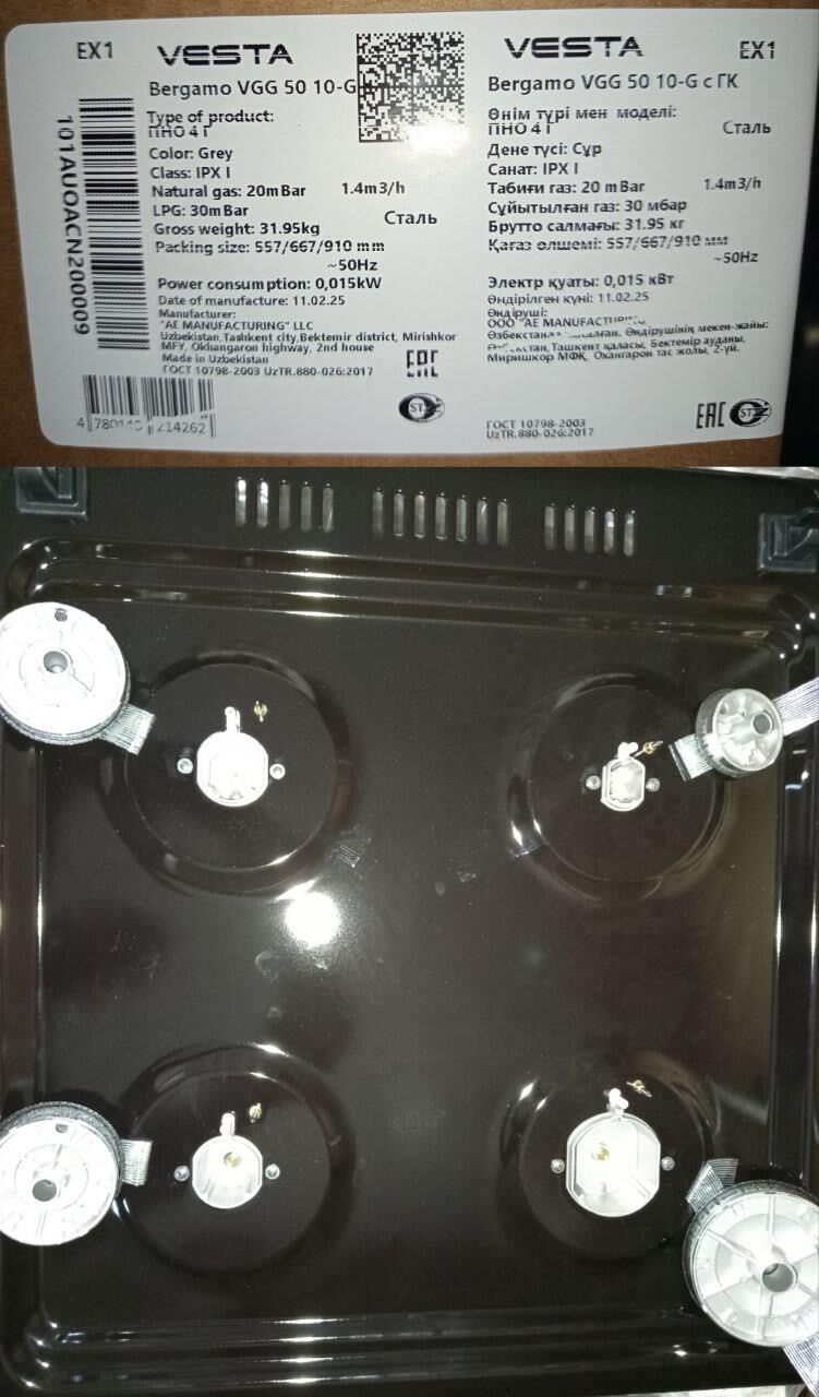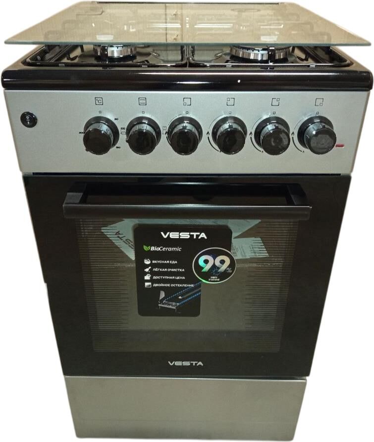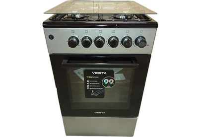 Горелки стола: Газовые – 4 шт. Газ.Контроль - рабочего стола. Мощность горелок рабочего стола: Горелка передняя левая/правая – 2,0/2,4 кВт. Горелка задняя левая/правая – 2,0/1,0 кВт. Электрический духовой шкаф. Объем духовки в литрах: 65 л. Верхний/нижний нагреватель духовки – тен.Решетка рабочего стола – сталь. Крышка рабочего стола – стекло. Термометр духовки. Кнопка электророзжига горелок стола. ГК рабочей поверхностиЭлектрическая подсветка духовки. Противень – 2 шт. В/Ш/Г 850/500/570