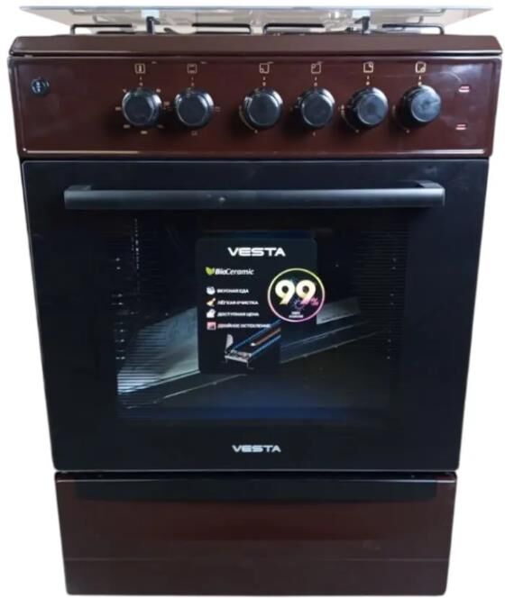 Горелки стола: Газовые – 3 шт. Электр.–1 шт. Выдвижной ящик для посуды. Мощность горелок рабочего стола: -Горелка передняя левая/правая – 2,0/2,4 кВт. Горелка задняя левая, электрическая – 1,5 кВт. Горелка задняя правая – 1,0 кВт. Решетка рабочего стола – сталь. Крышка рабочего стола – стекло. Верхний нагреватель духовки – ТЭН. Нижний нагреватель духовки – ТЭН. Электророзжиг при помощи кнопки. Электрическая подсветка духовки. Термостат, Индикатор работы электроконфорок. Индикатор работы ТЭНа духовки. Противень – 2 шт.; .В/Ш/Г 850/600/6000