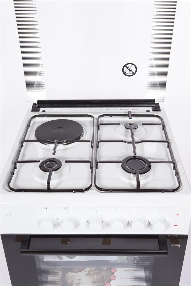 ШхВхГ: 50х85х60 см; Цвет: белый; Тип духовки: электрическая; Тип варочной панели: комбинированная; 3 горелки -газовые, 1горелка - электрическая; Дополнительные функции: термостат; Особенности конструкции: подсветка духовки; Электроподжиг