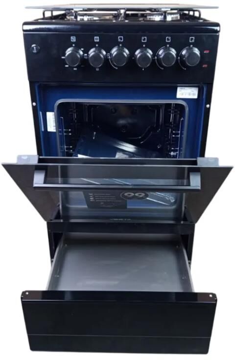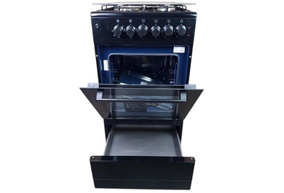 Горелки стола: Газовые – 3 шт. Электр.–1 шт. Выдвижной ящик для посуды. Мощность горелок рабочего стола: -Горелка передняя левая/правая – 2,0/2,4 кВт. Горелка задняя левая, электрическая – 1,5 кВт. Горелка задняя правая – 1,0 кВт. Решетка рабочего стола – сталь. Крышка рабочего стола – стекло. Верхний нагреватель духовки – ТЭН. Нижний нагреватель духовки – ТЭН. Электророзжиг при помощи кнопки. Электрическая подсветка духовки. Термостат, Индикатор работы электроконфорок. Индикатор работы ТЭНа духовки. Противень – 2 шт.