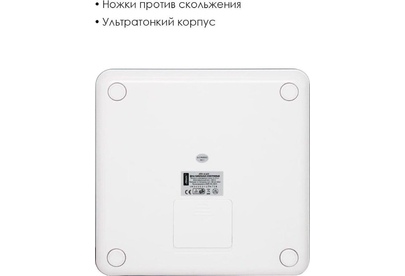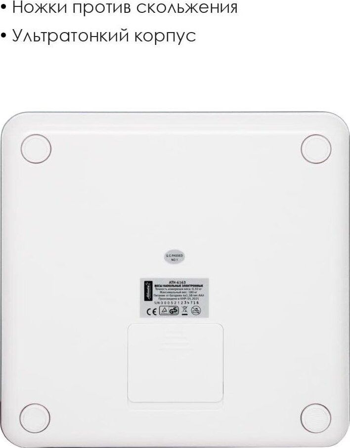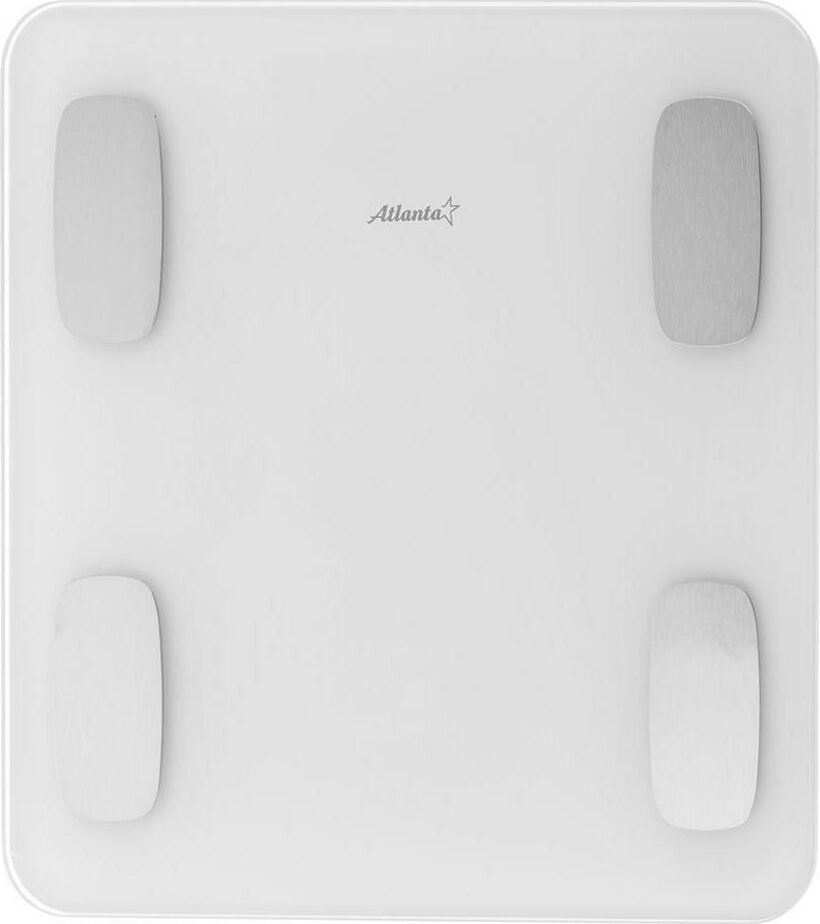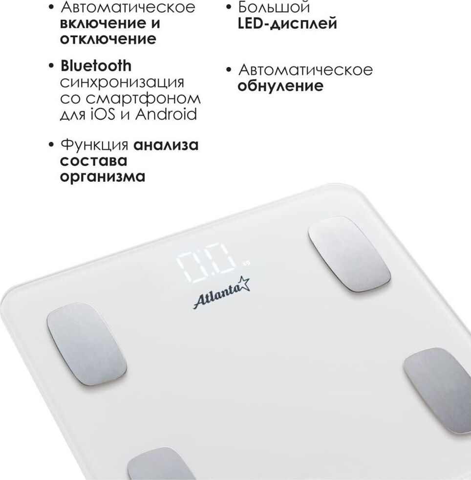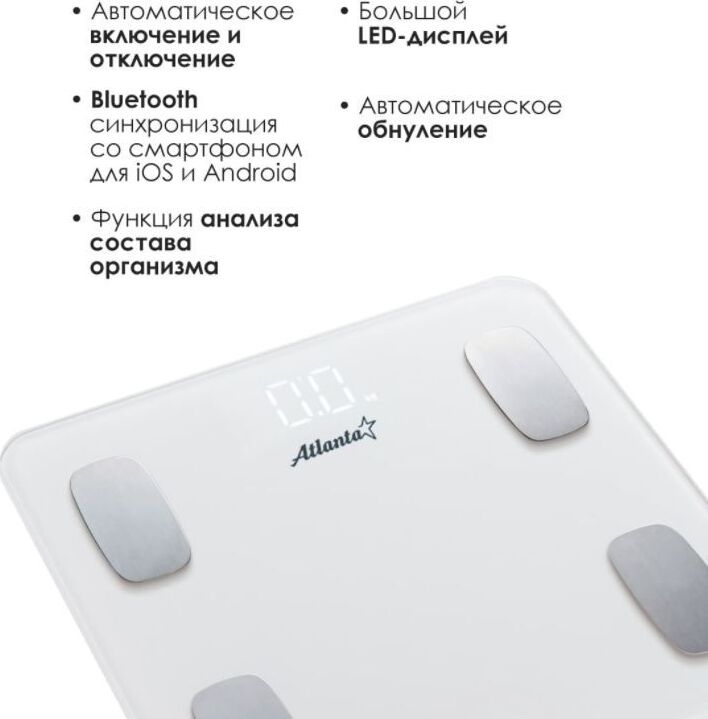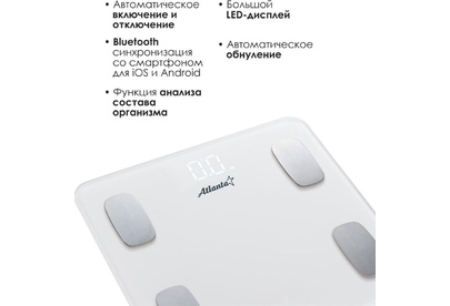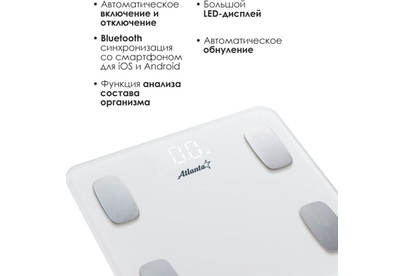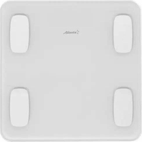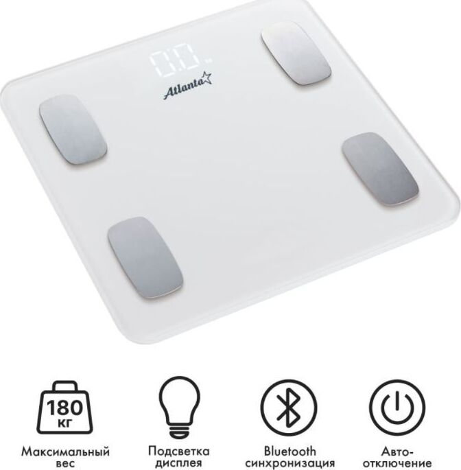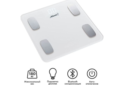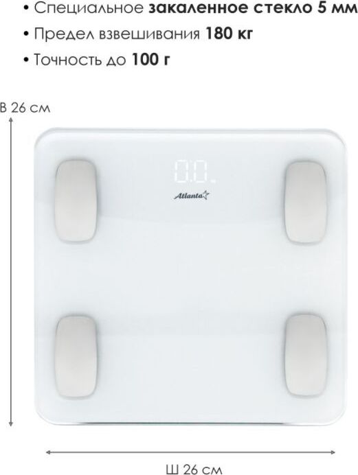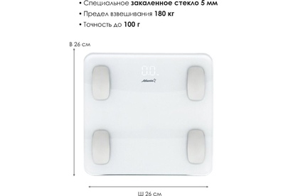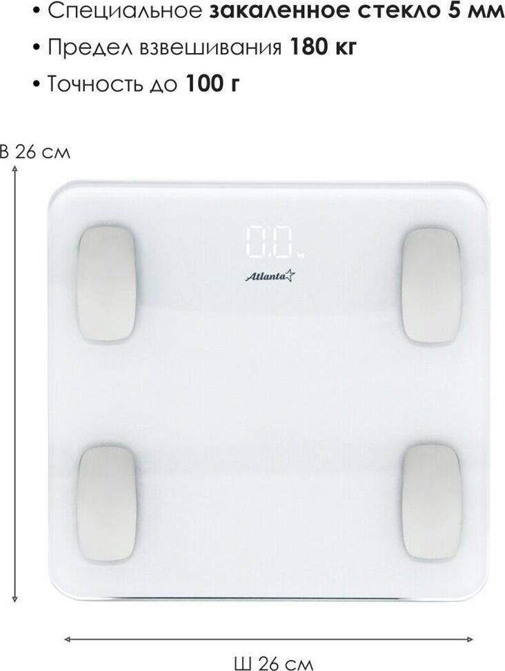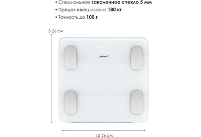ATLANTA ATH-6163 (WHITE) Анализатор организма, 28 х 28 х 2 см, стекло 5 мм, до180 кг, точность 100 г. КОРПУС Специальные высокопрочные материалы и новая технология дают возможность увеличить предел взвешивания до 180 кг. ТОЧНОСТЬ Полностью электронный принцип взвешивания на системе из четырех сенсоров гарантирует высокую точность измерения Вашего веса. Благодаря отсутствию механических элементов, весы прослужат многие годы. СОВРЕМЕННЫЙ ДИЗАЙН Благодаря превосходному дизайну, выполненному с учетом самых современных тенденций, весы удачно впишутся в интерьер помещений. АНАЛИЗАТОР ТЕЛА Весы снабжены анализатором биоэлектрического сопротивления позволяющего получать полные сведения о составе тела: жировая масса, процентное соотношение воды, костной и мышечной тканей. Дополнительно предусмотрена возможность использовать прибор детям от 10 лет.