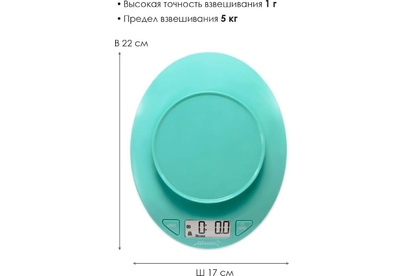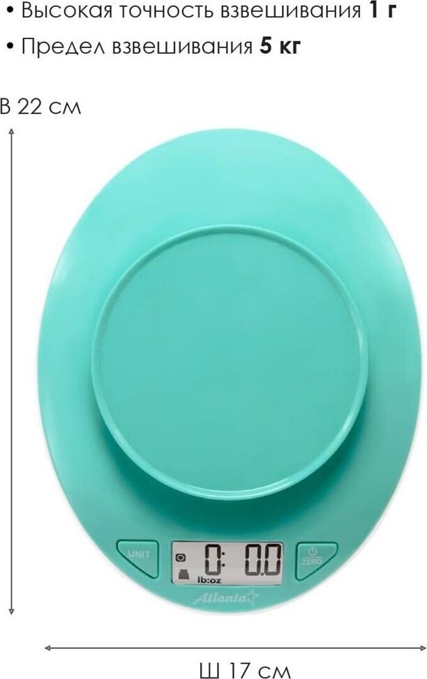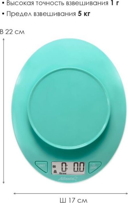 ATLANTA ATH-6199 (GREEN) Пластиковая рабочая поверхность, максимальный вес 5 кг с шагом 1 г, LED-дисплей. ПОЛНОСТЬЮ ЭЛЕКТРОННЫЙ Полностью электронный принцип взвешивания на высокоточных сенсорах гарантирует точность измерения веса, а благодаря отсутствию механических механизмов, весы прослужат многие годы.