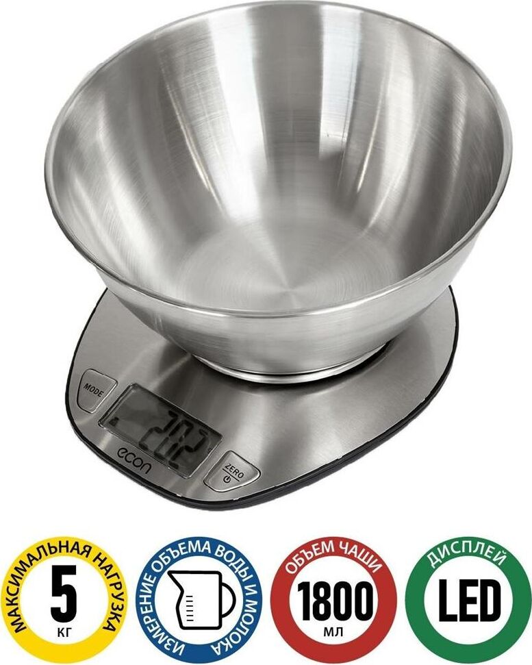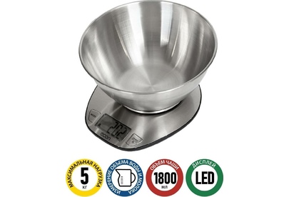 Кухонные электронные весы LCD дисплей 58x27 мм Оборудованы датчиком высокой точности Материал корпуса - металл Стальная чаша объемом 1.8 л Максимальный вес: 5 кг Функция "Вес Тары" Определение объема молока и воды Индикация разряда батареи Индикация перегрузки Автоматическое отключение