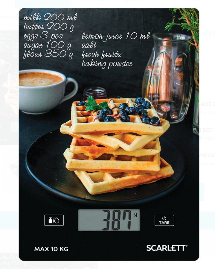 Электронные Кухонные весы Максимальный вес, кг: 10 Цена деления, г: 1 Единицы измерения: Граммы, фунты, унции, миллилитры Материал платформы: Ударопрочное стекло Индикатор заряда батарейки: Да Индикатор перезагрузки: Да Автоматическое отключение: Да Элемент питания: 2 батарейки типа ААА (включены в комплект) Цвет: Вафли