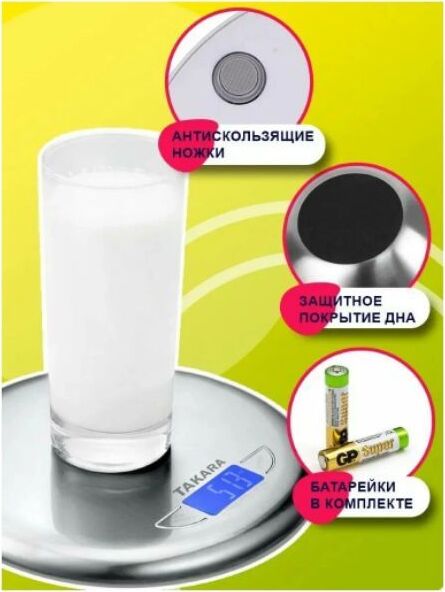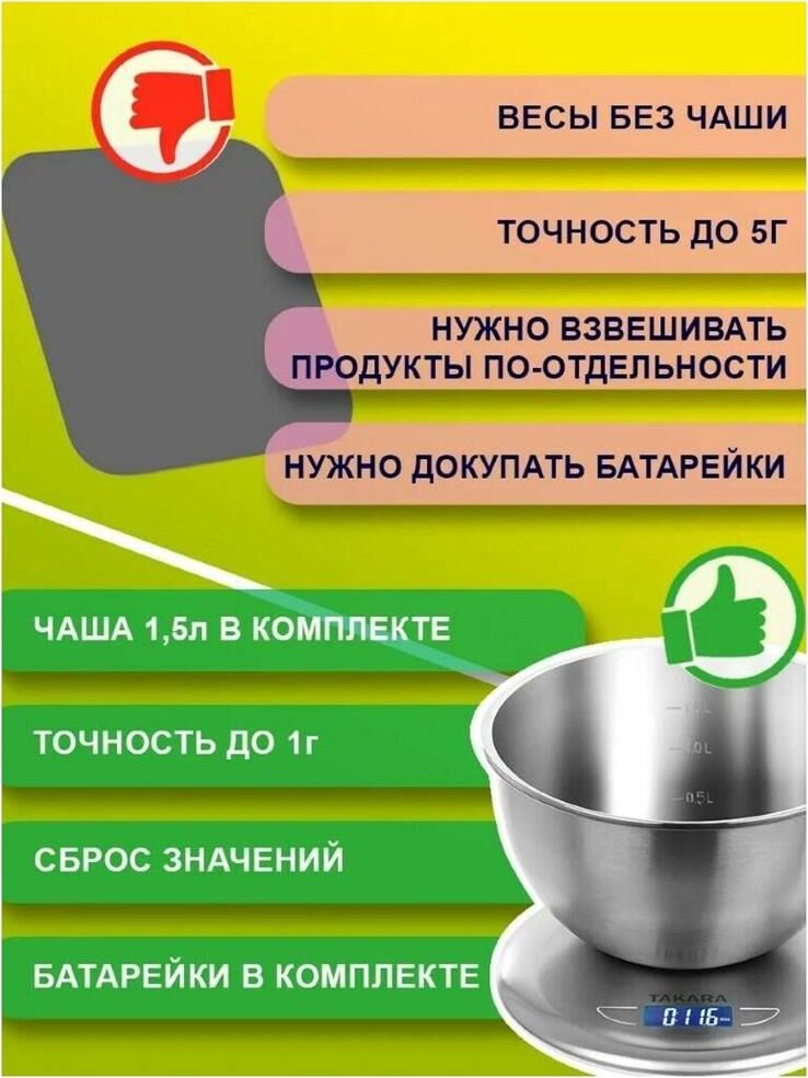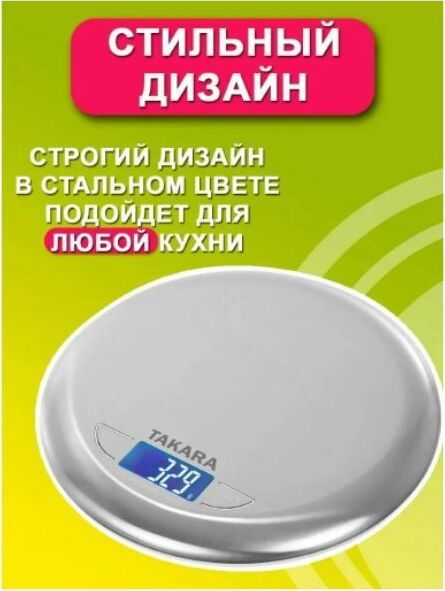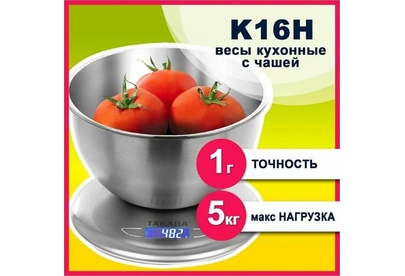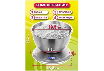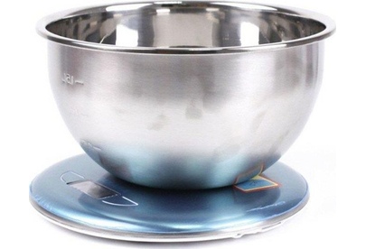 Кухонные весы с чашей для продуктов с ЖК-дисплеем обеспечивают точное взвешивание продуктов массой до 5 килограммов с точностью до 1 грамма и способны работать в различных единицах измерения (г, мл, унция, фунт). Функция «ТАРА» позволяет не учитывать массу посуды при взвешивании продуктов. 1,5-литровая чаша из нержавеющей стали со шкалой от 0,5 до 1,5 литров с шагом 0,5 л поможет более точно определить объем сыпучих и жидких объектов. На дне чаши имеется нескользящее покрытие, благодаря которому чаша не скользит и не царапает поверхность весов. Размеры: 185*185*18мм Размер ЖК-дисплея: 41*18мм Точность: 2%+1г Максимальная вместимость: 5кг Подсветка дисплея Нержавеющая сталь Датчик высокой точности Защита от перегрузки Индикатор разряда батареи Автоматическое или ручное отключение