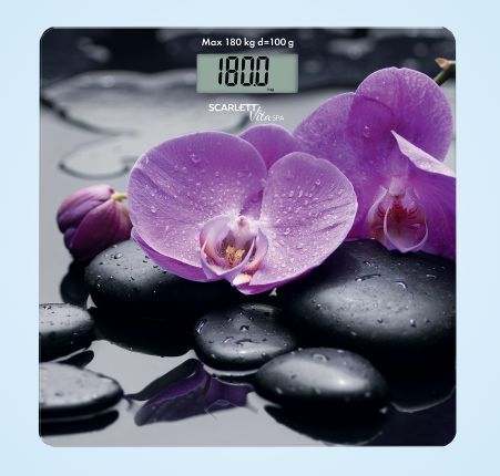 Тип: Электронные. Материал корпуса: Стекло. Максимальный вес, кг: 180. Цена деления, г: 100. Индикатор заряда батарейки: Да. Индикатор перезагрузки: Да. Автоматическое включение/выключение: Да. Тип батарейки/B/шт.: 1 х ЗV типа CR2032 (в комплекте). Рисунок: Орхидеи. Прорезиненные ножки для устойчивости: Да.